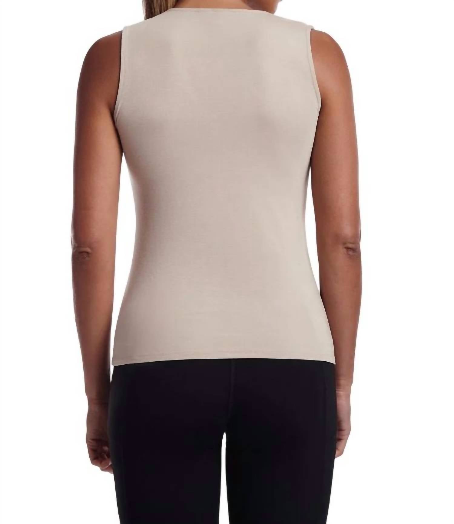 Рост модели 5 футов 10 дюймов, размер S. 90% вискоза, 10% нейлон. Машинная стирка в холодной воде, не отбеливать, сушить на горизонтальной поверхности, гладить при низкой температуре при необходимости или химчистка. Импортная. Стиль пуловер. V-образный вырез. Топ без рукавов. Прямой подол.