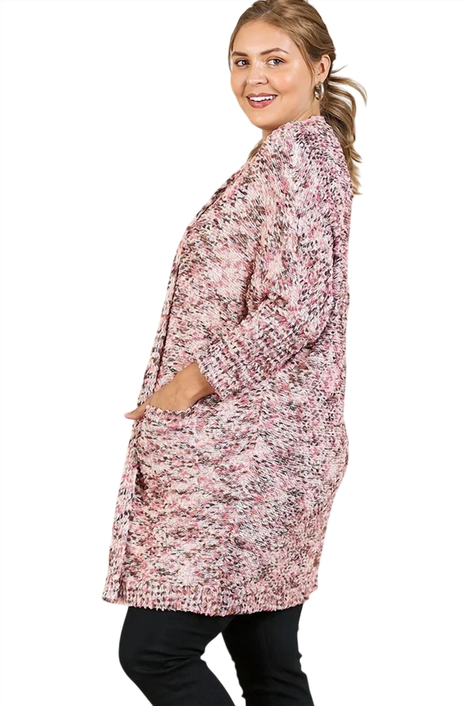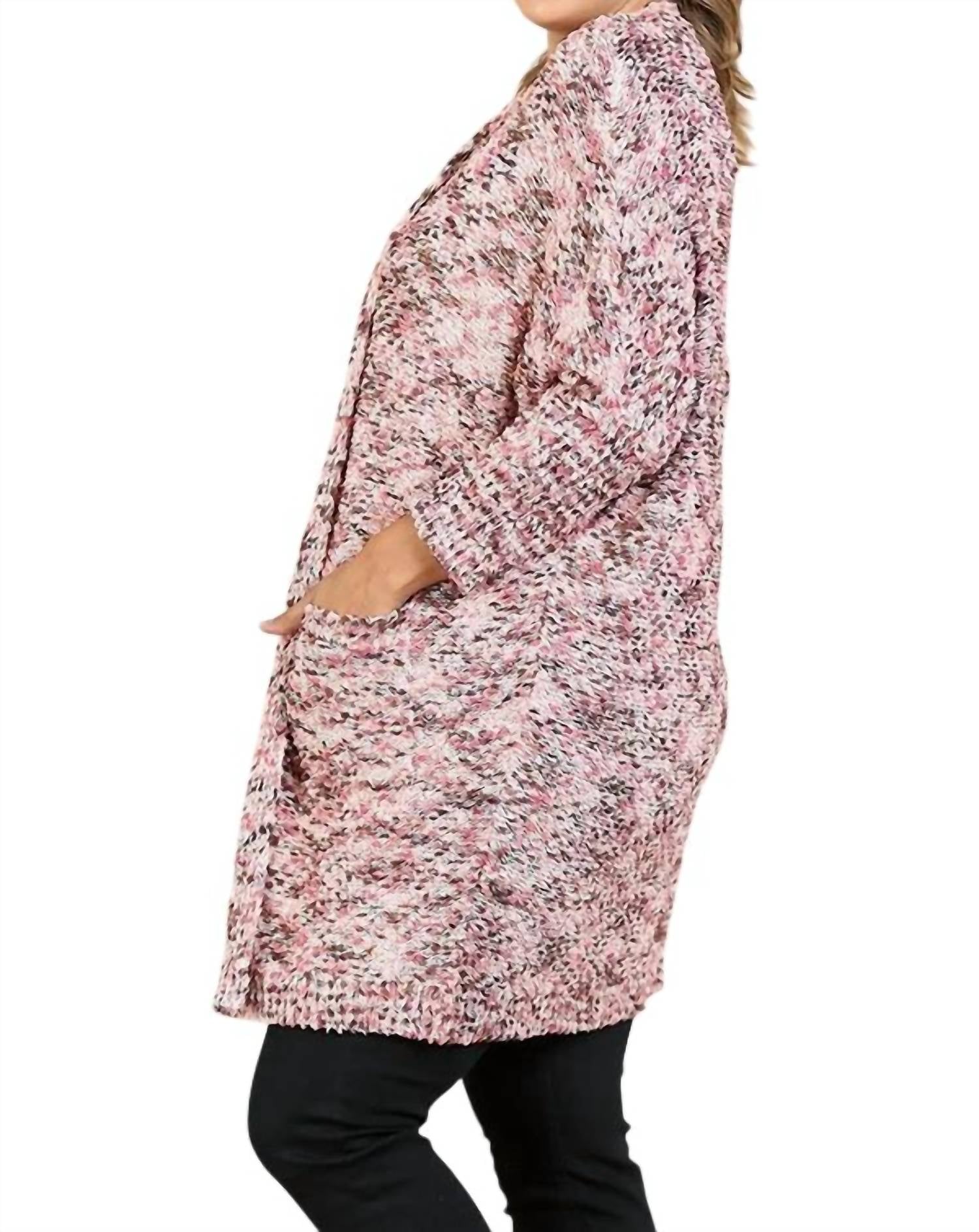 Розовый многоцветный трикотаж очень универсален. Этот кардиган имеет длинные рукава «летучая мышь». Открытый перед. Два накладных кармана. Длинная длина. Силуэт oversize. Маленькая грудь 52" длина 31". Средняя грудь 54" длина 31". Большая грудь 56" длина 31". 55% хлопок 45% полиэстер. Импортный. Только химчистка.