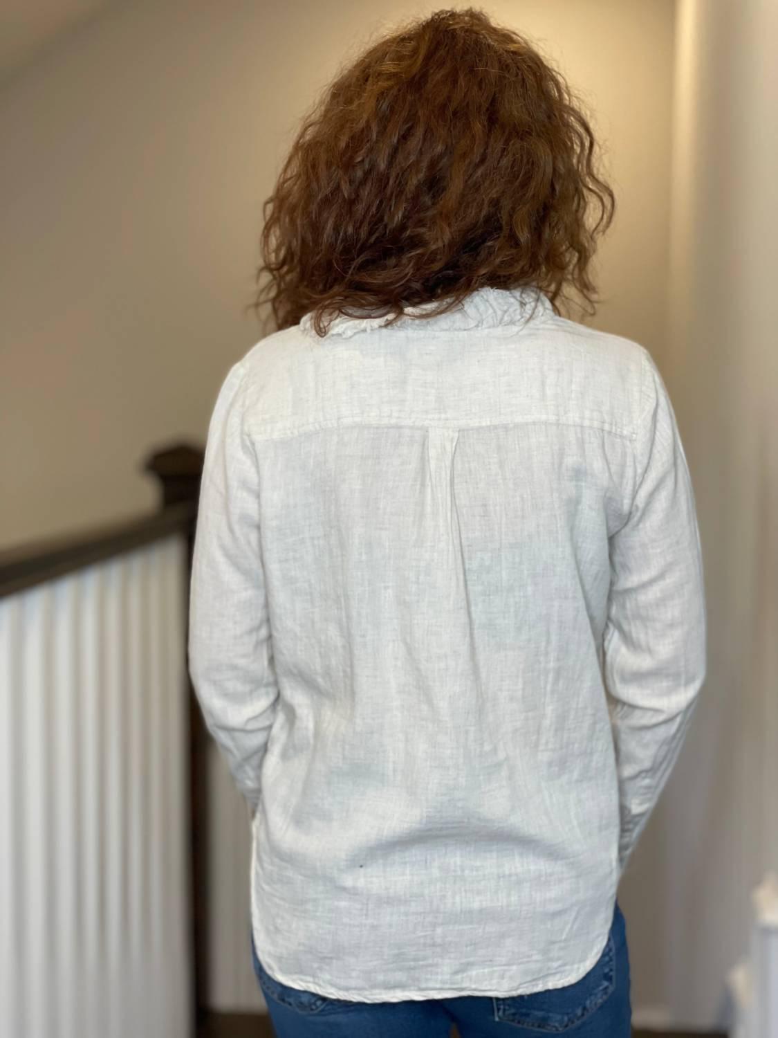 Эта женственная блузка имеет очаровательный V-образный вырез и воротник-рюш, а также длинные рукава и застежку на пуговицы для изысканного вида. Изготовленная из 100% хлопка, она обеспечивает легкий и выгодный крой. Уход прост: машинная стирка в холодной воде на деликатном режиме и сушка в стиральной машине при низкой температуре. Модель Кэтлин ростом 5 футов 4 дюйма, на ней размер small.