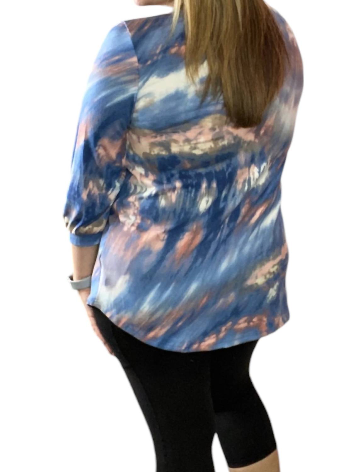 V-образный вырез. Модель надевается. Рукава три четверти. 96% полиэстер, 4% спандекс. Машинная стирка в холодной воде.