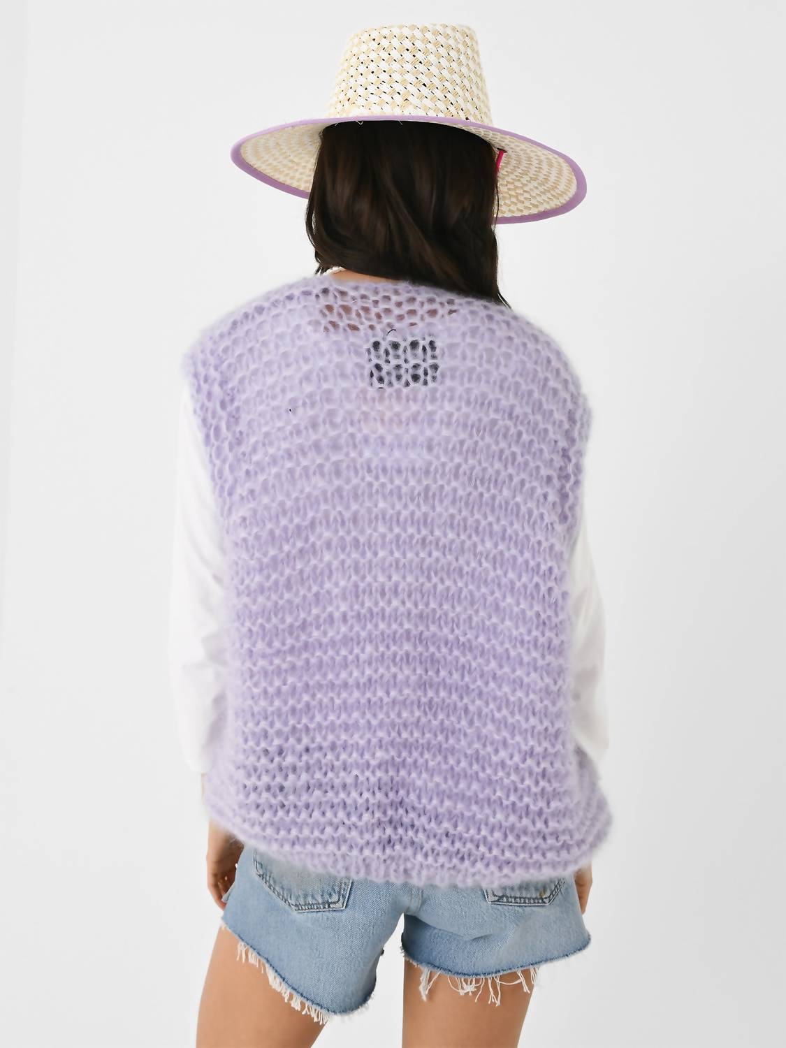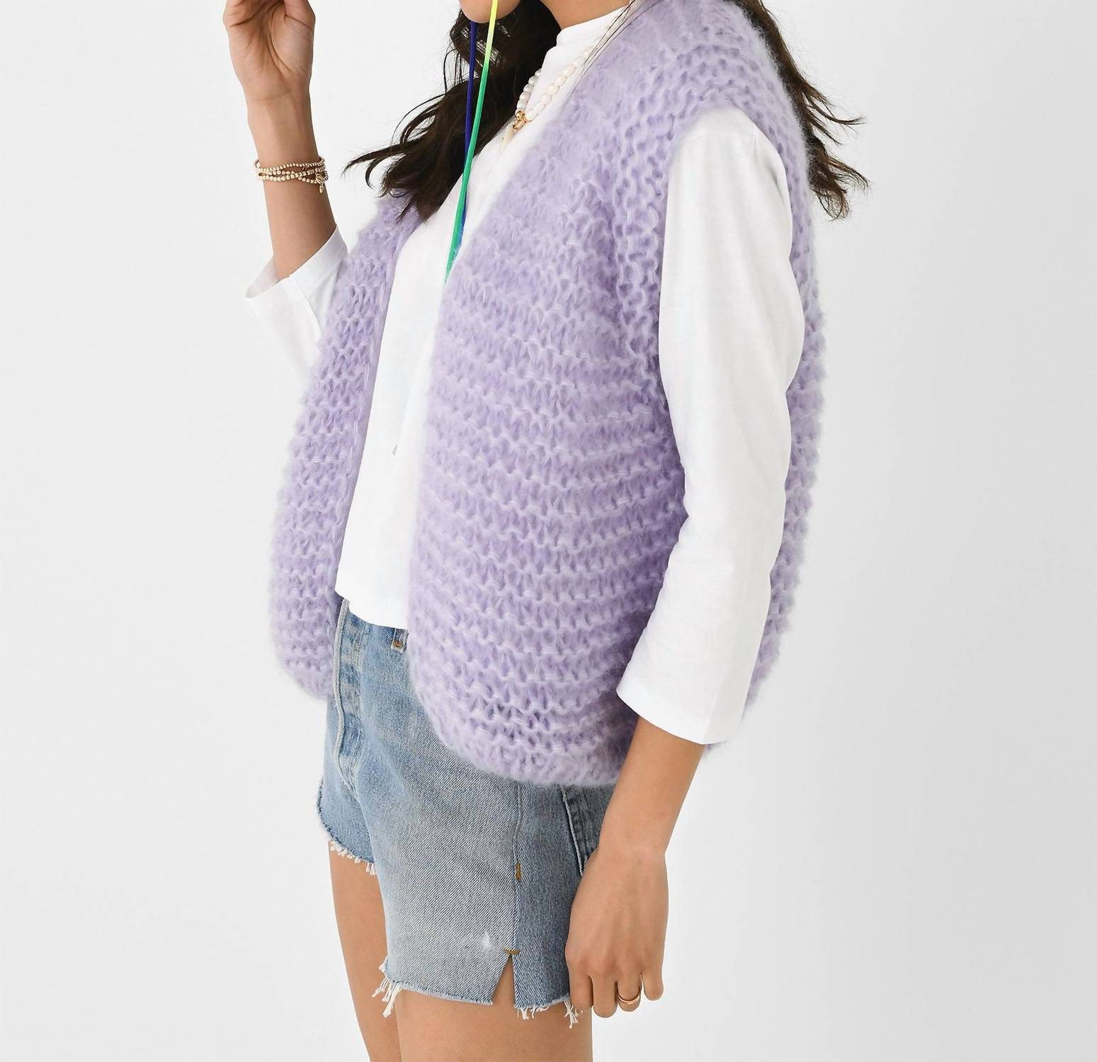 Кардиган без рукавов из мягкой ткани грубой вязки с открытым передом, ребристым подолом, объемной вязкой, выполнен из мохера, шелка и полиэстера в классическом крое. На модели жилет размера S/M. Параметры модели: рост — 5 футов 8 дюймов | бюст — 32C | талия — 25 дюймов | бедра — 36 дюймов | размер платья — 2 (США).