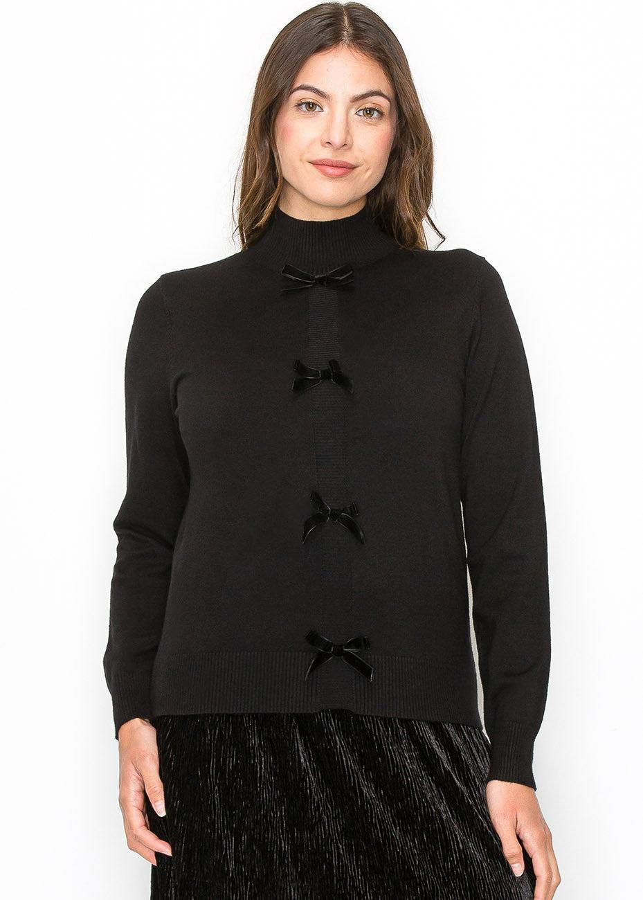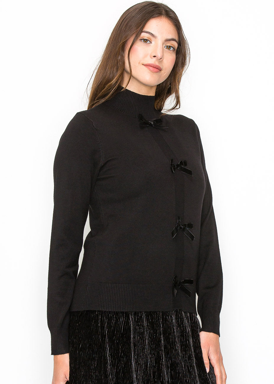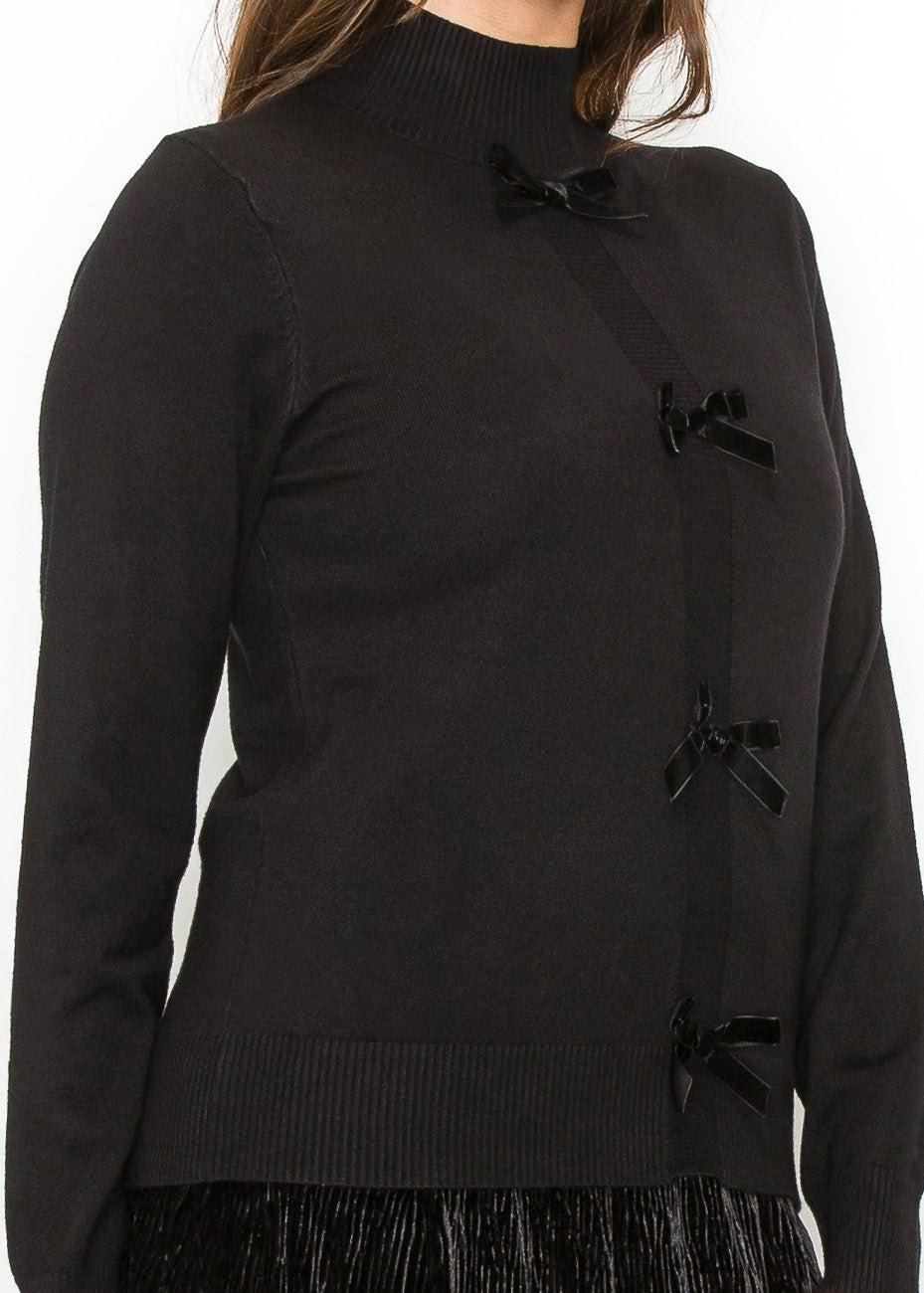 Добавьте игривости в свой гардероб с этим черным вязаным свитером, с тремя бархатными бантами для женственности. Высокий вырез и мягкий материал делают его элегантным и уютным, идеально подходящим для надевания поверх ваших любимых юбок.