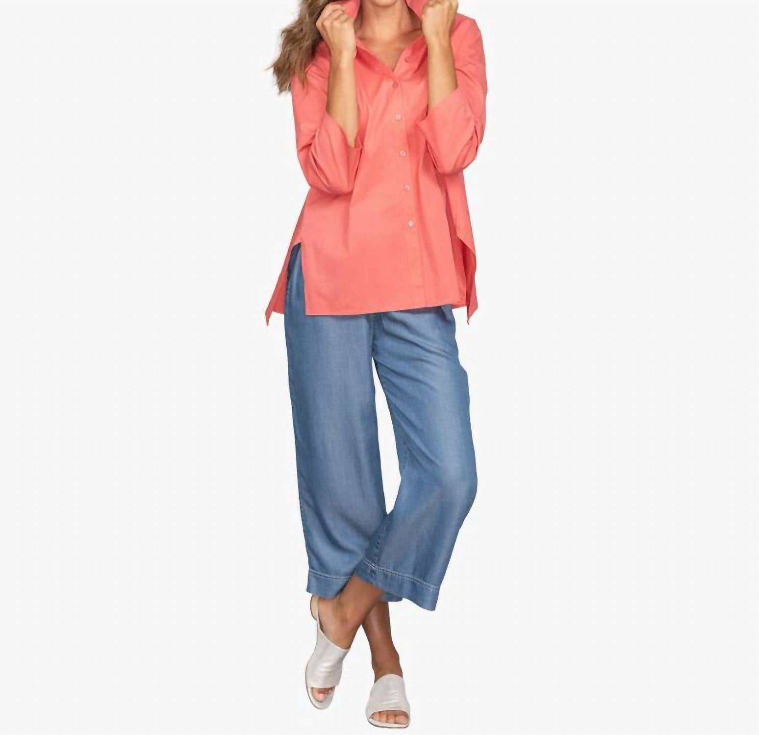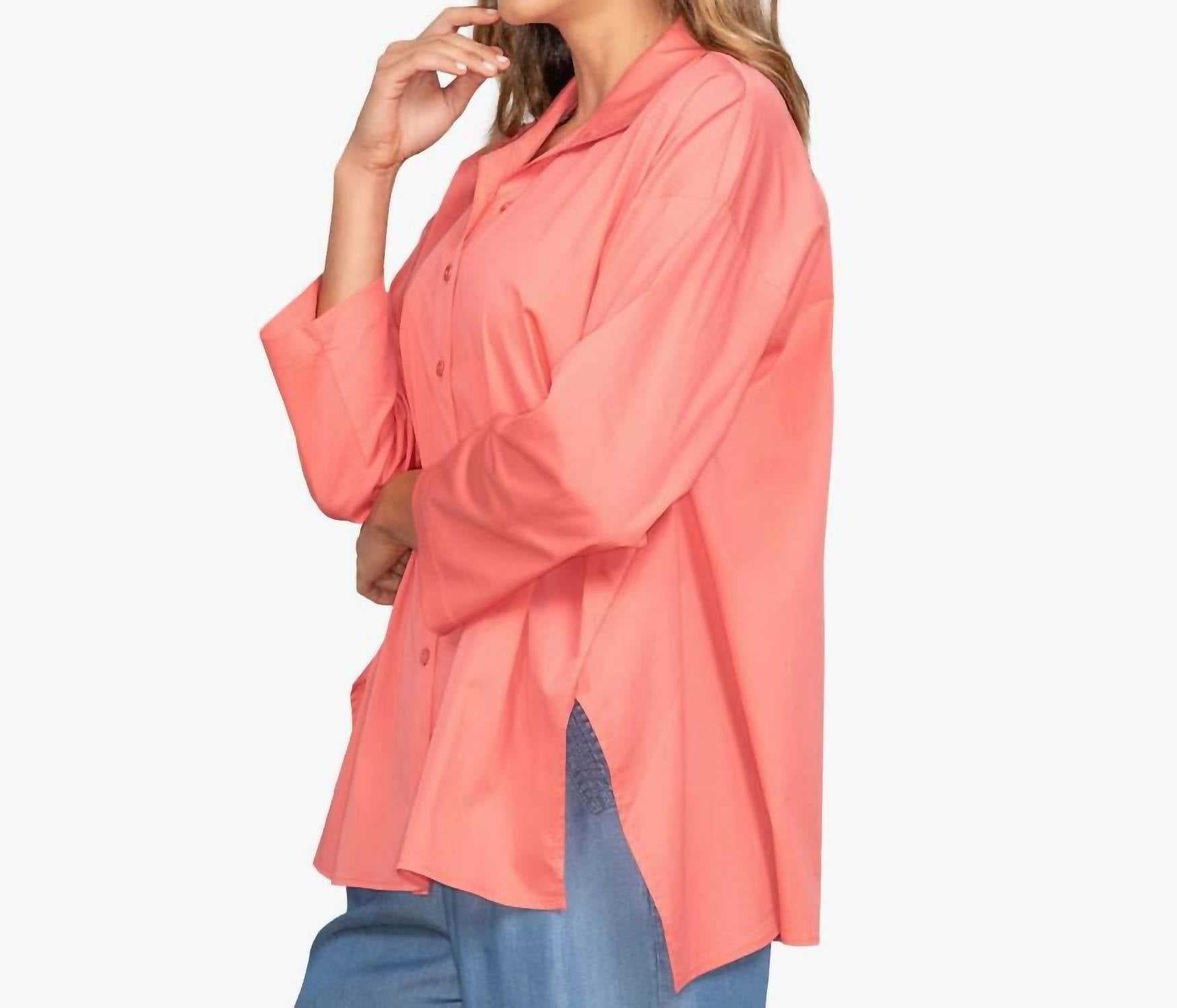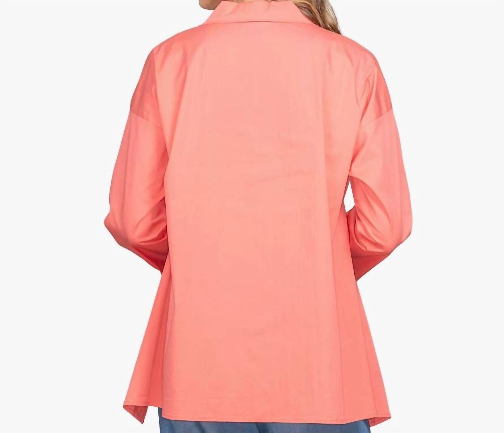Рубашка oversize из эластичного хлопкового поплина. Длина по спинке составляет примерно 28 дюймов в размере S. Модель ростом 5 футов 11 дюймов носит размер S/M.