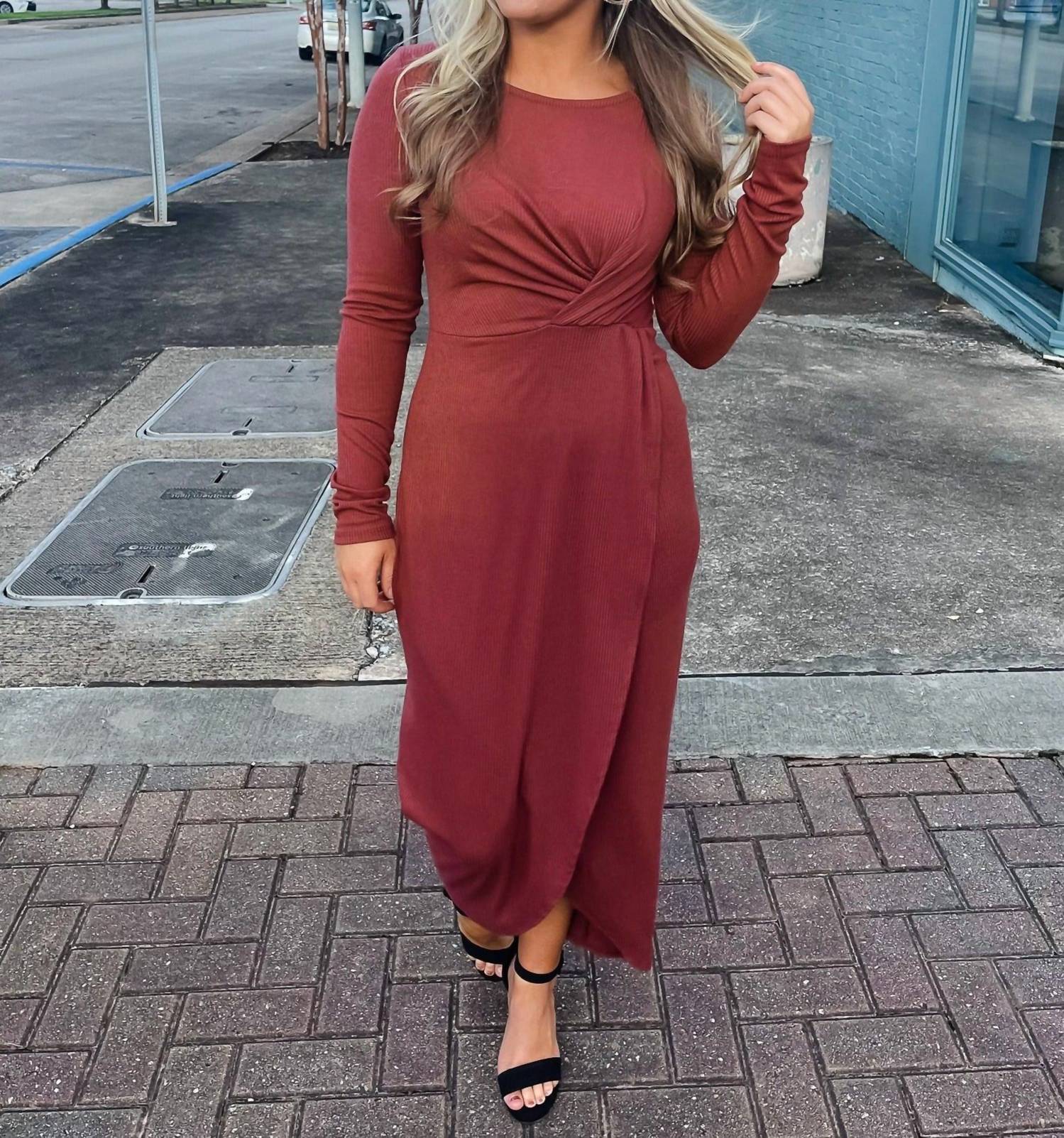 Длинные рукава и современный силуэт с имитацией запаха. Привлекательный красный и коричневый цвет. Дизайн с круглым вырезом и застежкой-липучкой для непринужденной элегантности. Легко дополнит вашу фигуру.