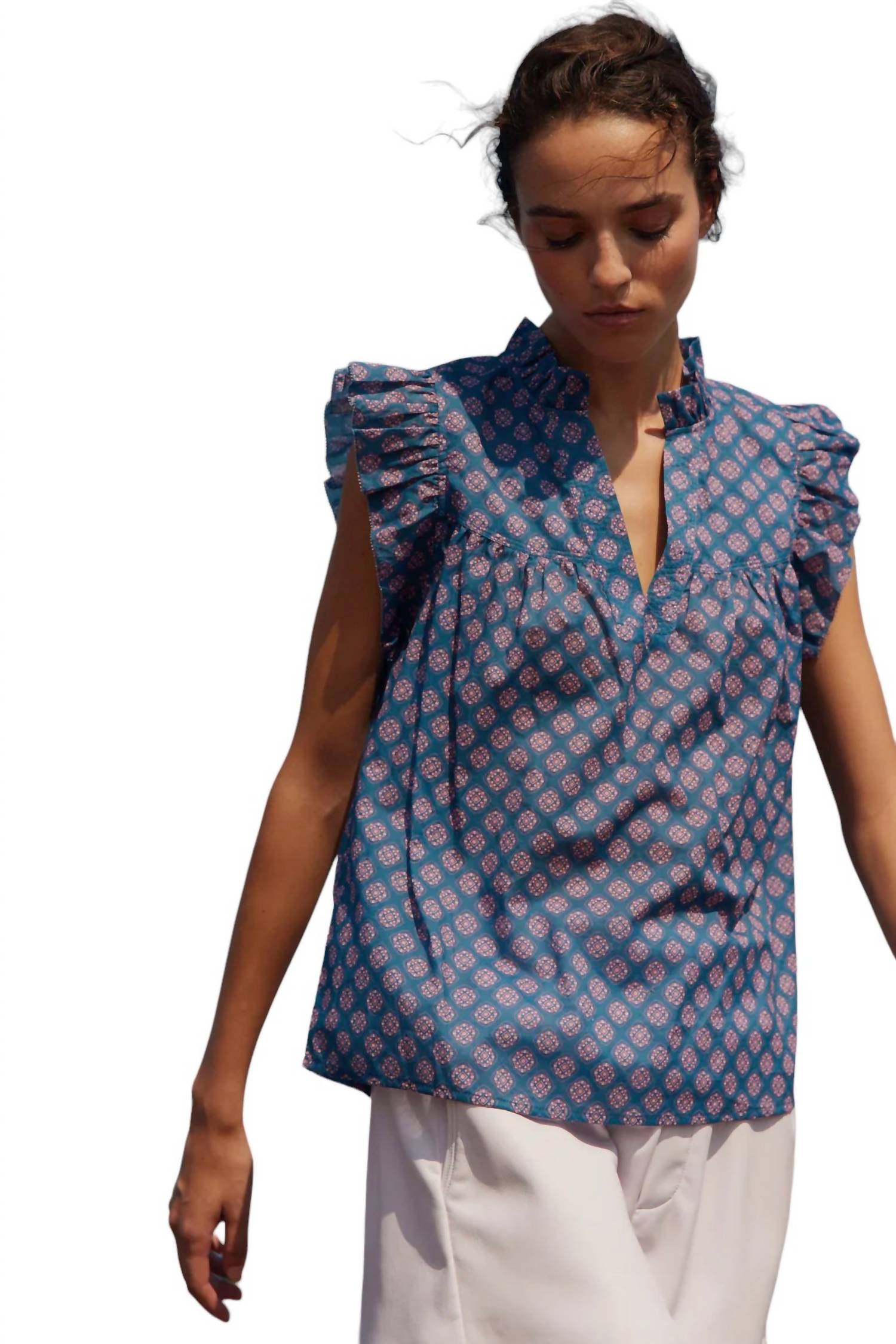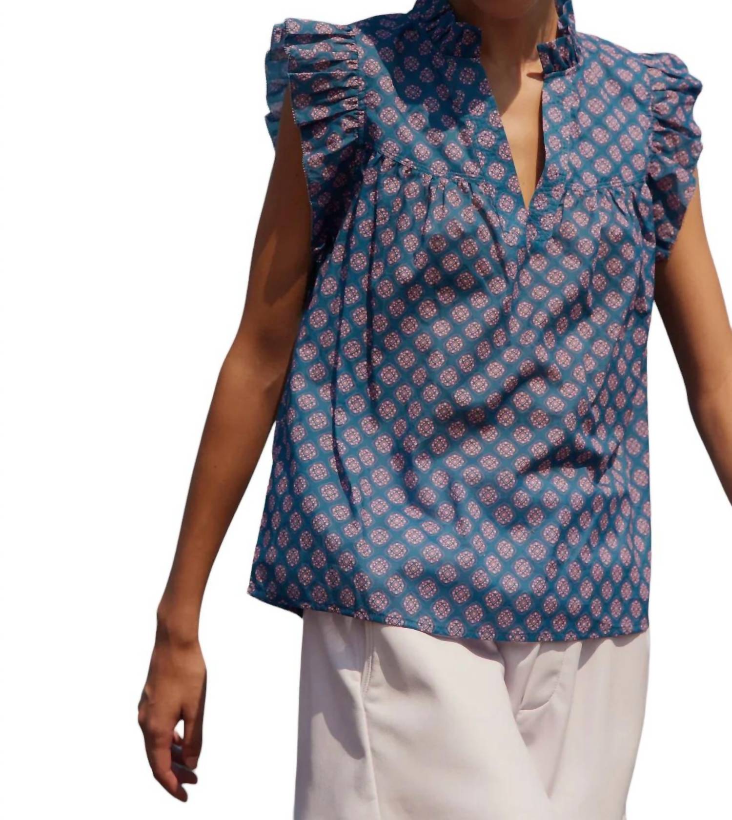 Эта блузка без рукавов Spencer выполнена из 100% хлопка с оборками, V-образным вырезом и узорчатым дизайном. Застежка-липучка.