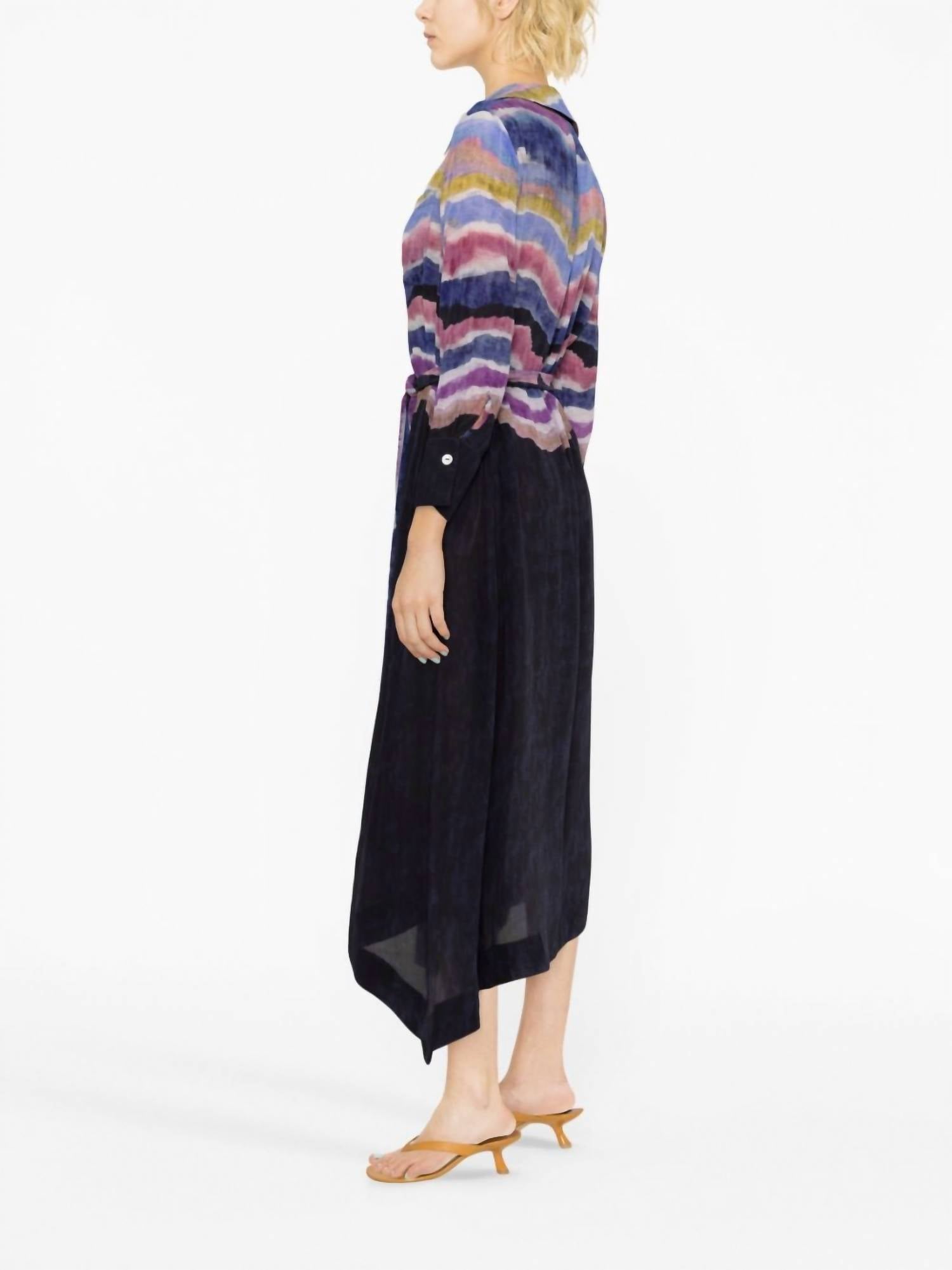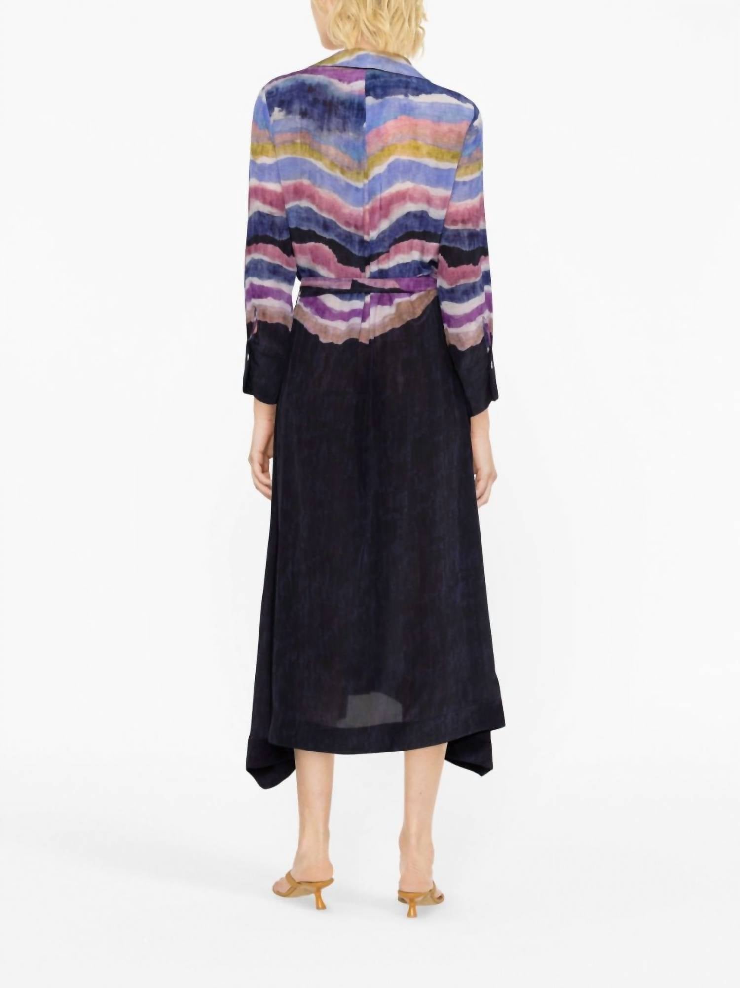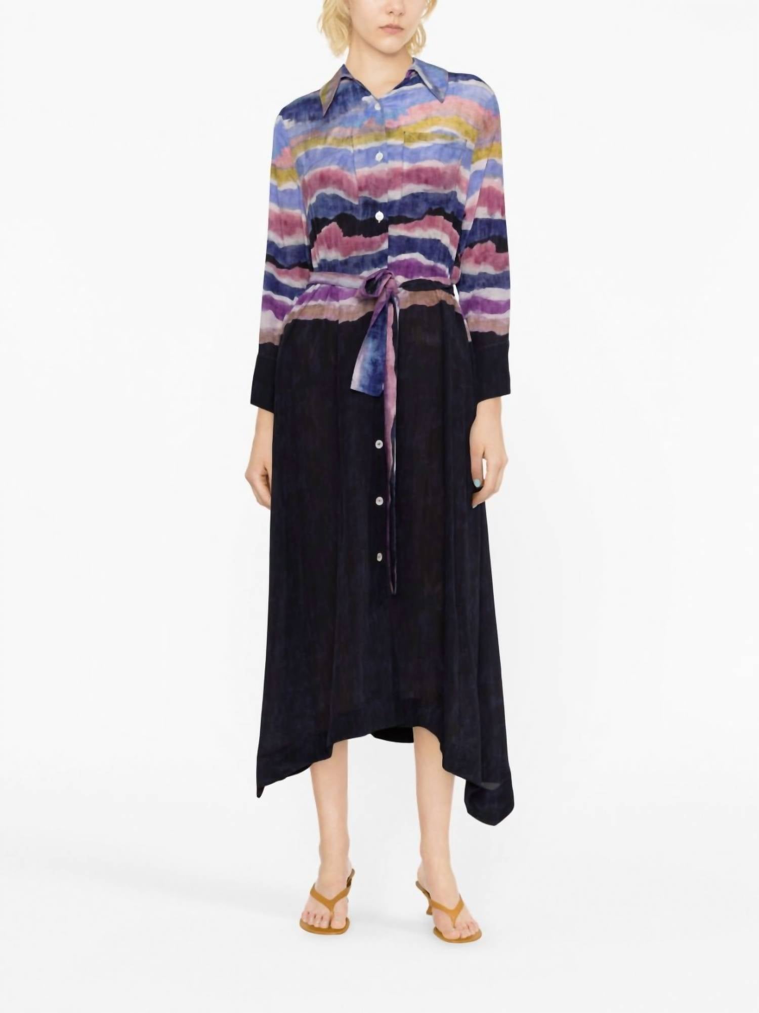 Это платье-рубашка из шелка Ella изготовлено из роскошного шелкового крепа, имеет красивый нарисованный вручную принт с акварельными мазками. Оно имеет свободный, облегающий силуэт с острым воротником. 100% шелк. Kaia Navy. Соответствует размеру