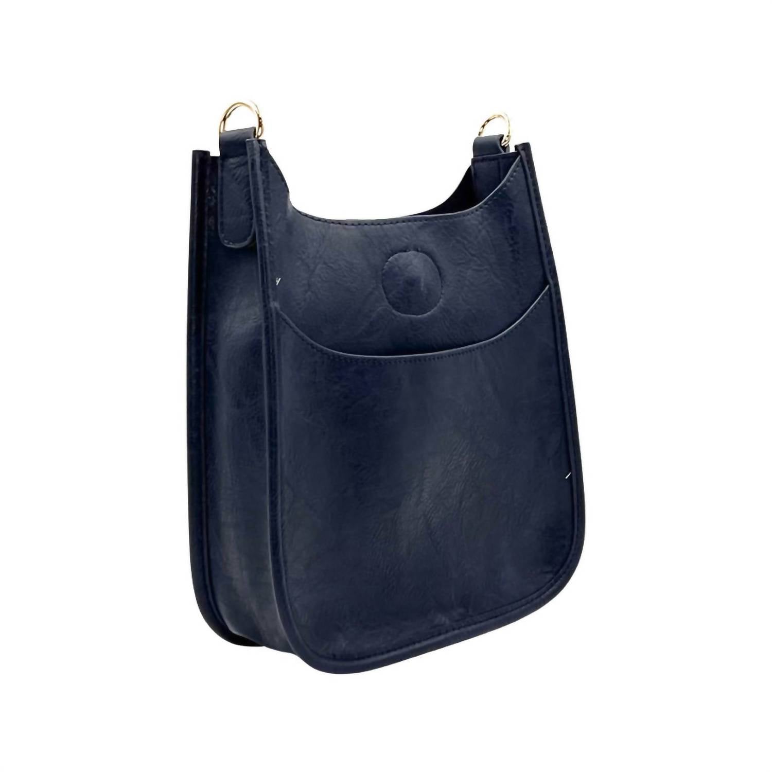 Сумка-мессенджер из веганской замши темно-синего цвета с золотой фурнитурой. Компактный размер - 9,5" В x 8,5" Ш x 2" Г. Основное отделение на кнопке с одним внешним открытым карманом. Ремешок в комплект не входит. Импортируется.