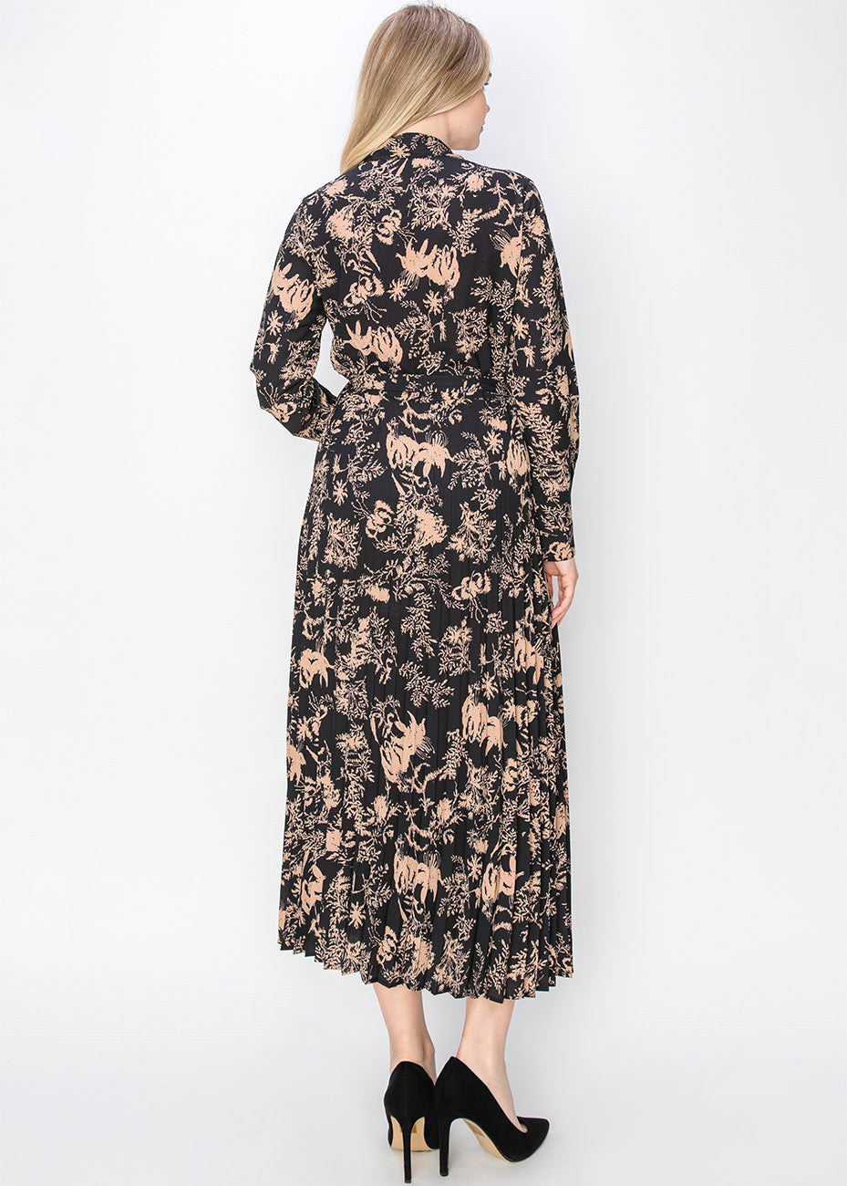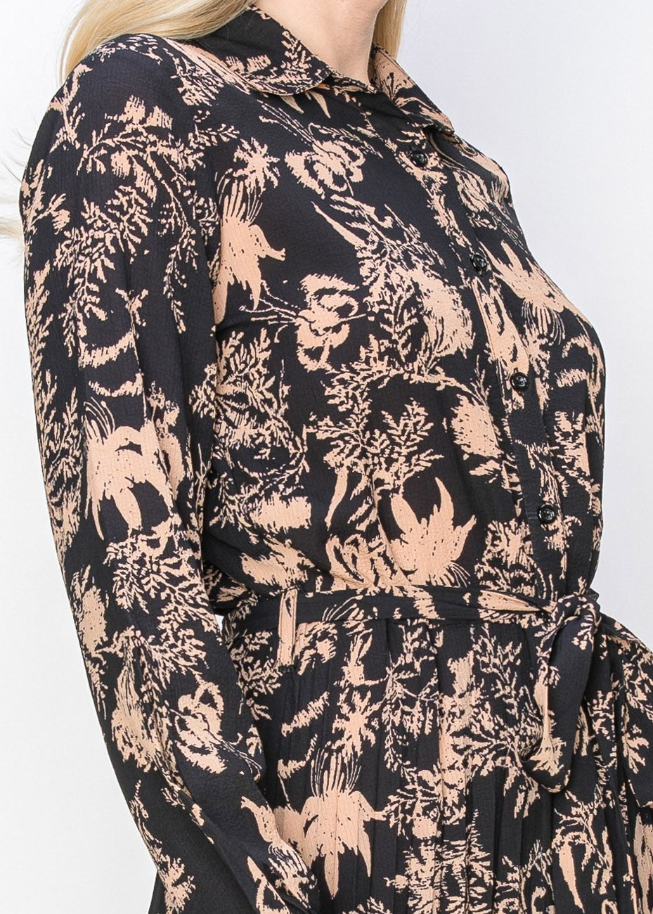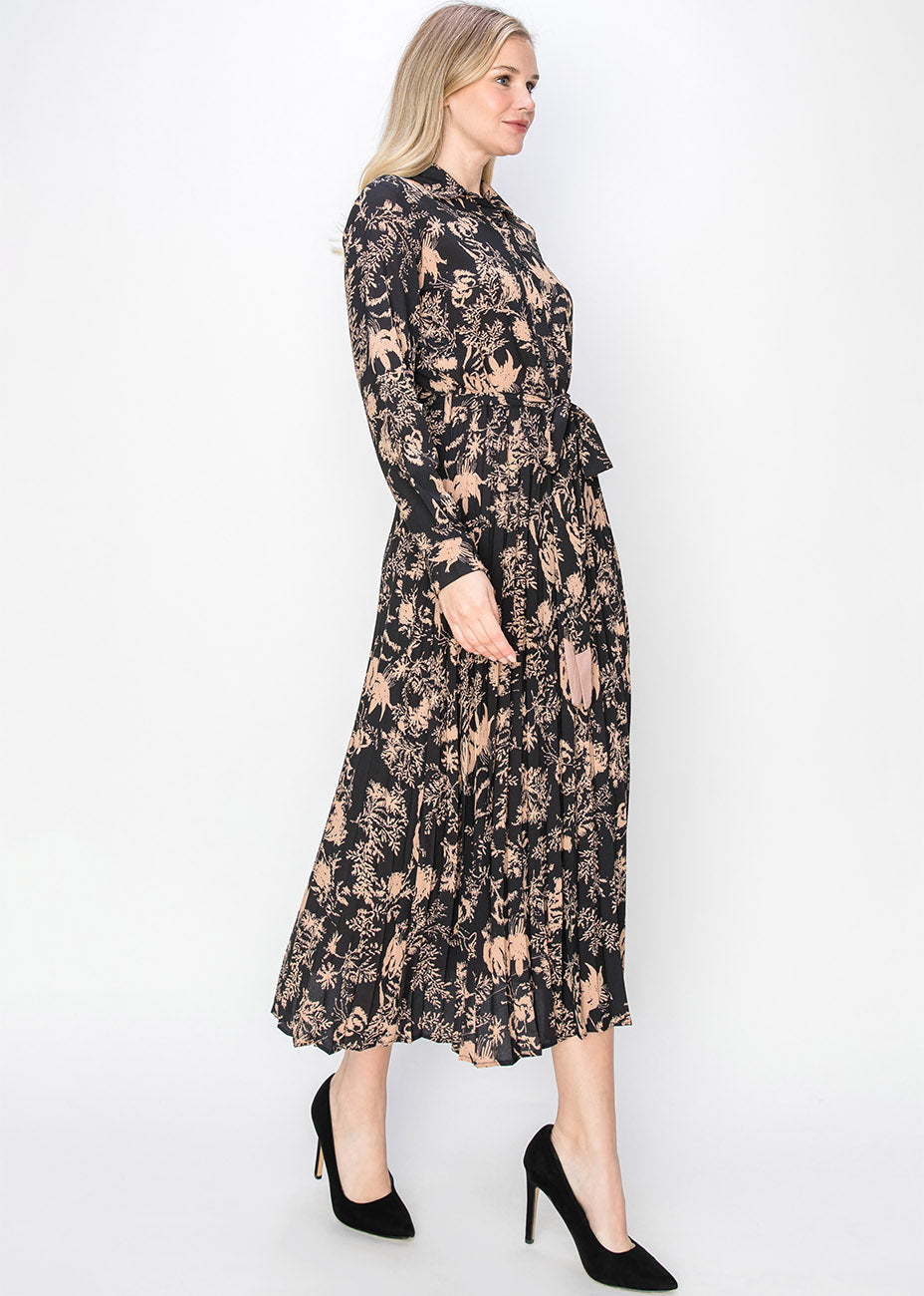 Вдохновленное природой, это платье с румяным цветочным принтом сочетает стиль и скромность. Застежка на пуговицы спереди и длинные рукава обеспечивают полное покрытие, а струящийся силуэт добавляет женственности. Утягивающая талия с завязкой придает структуру, а плиссированная юбка обеспечивает комфорт.
