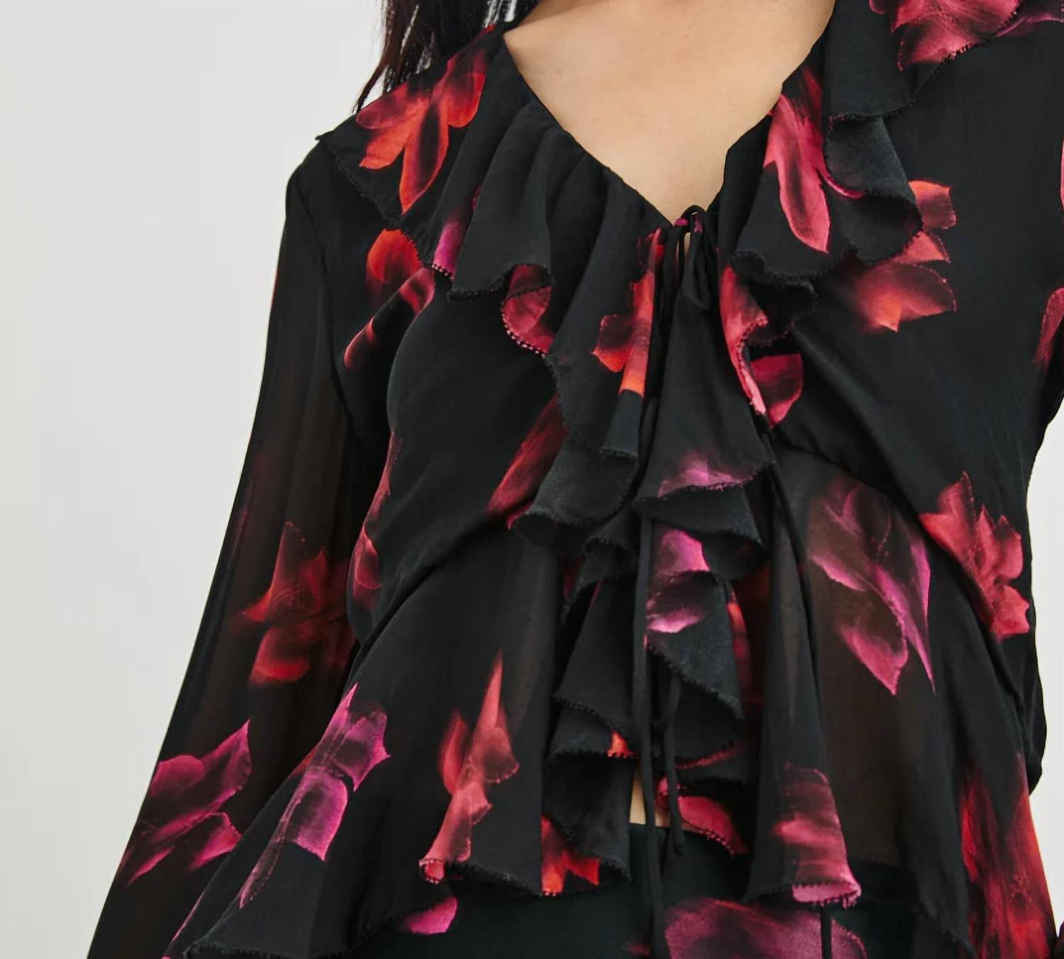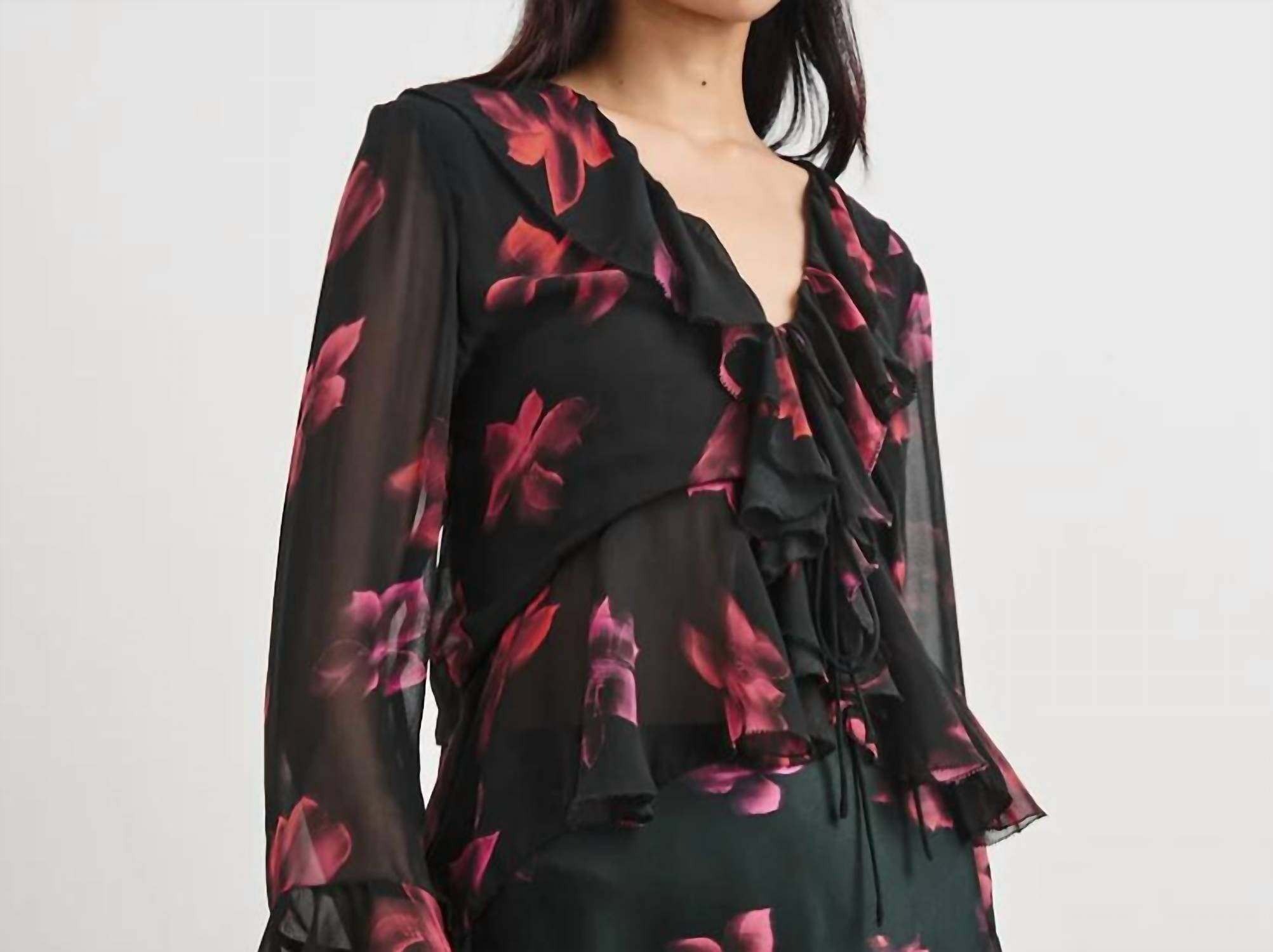 Вечная блузка, которая никогда не выйдет из моды. Раскройте своего внутреннего романтика с Nicoletta, ультраженственным шифоновым топом. С отделкой рюшами и рукавами, завязкой спереди и без подкладки для полупрозрачной эстетики. 100% вискоза. Импортный.