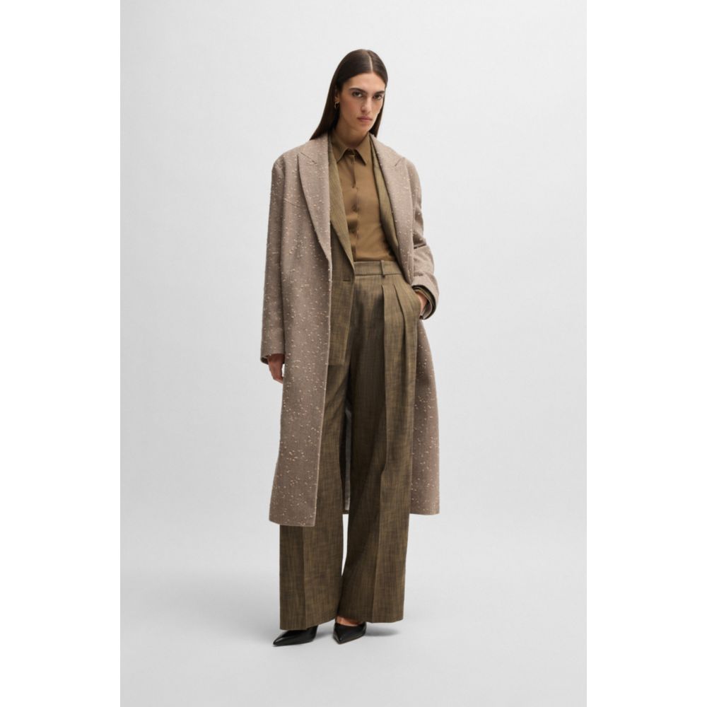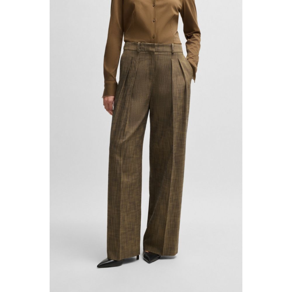 Брюки со складками спереди от BOSS Womenswear. Изготовленные из меланжевой портновской ткани, эти брюки со стандартной посадкой имеют прямой крой и широкие штанины.