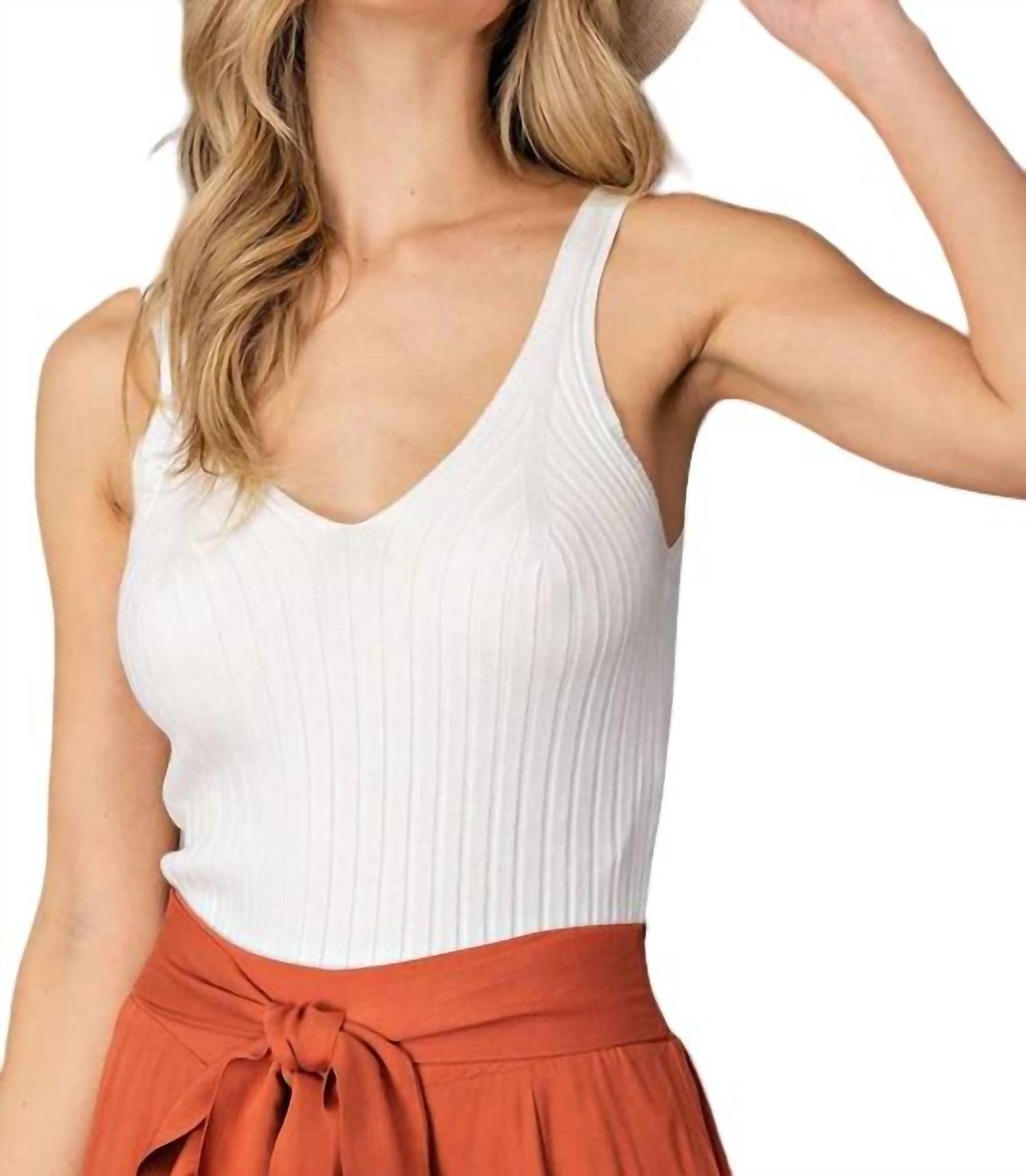 Ощутите непринужденный стиль и максимальный комфорт. Специально разработано для фигур plus-size. Приталенная майка. Изготовлена из роскошной трикотажной ткани в рубчик, которая облегает ваши изгибы. Глубокий V-образный вырез и низкая спинка. Обеспечивает как комфорт, так и шикарный стиль. Соответствует размеру или для более свободной посадки. Просто выберите на размер больше. Ощутите исключительность с этой элегантной базовой вещью без рукавов.