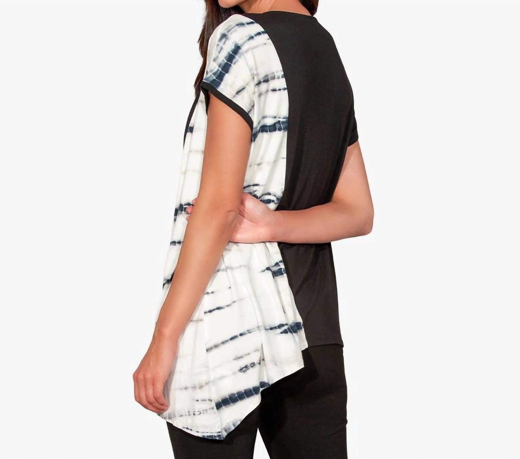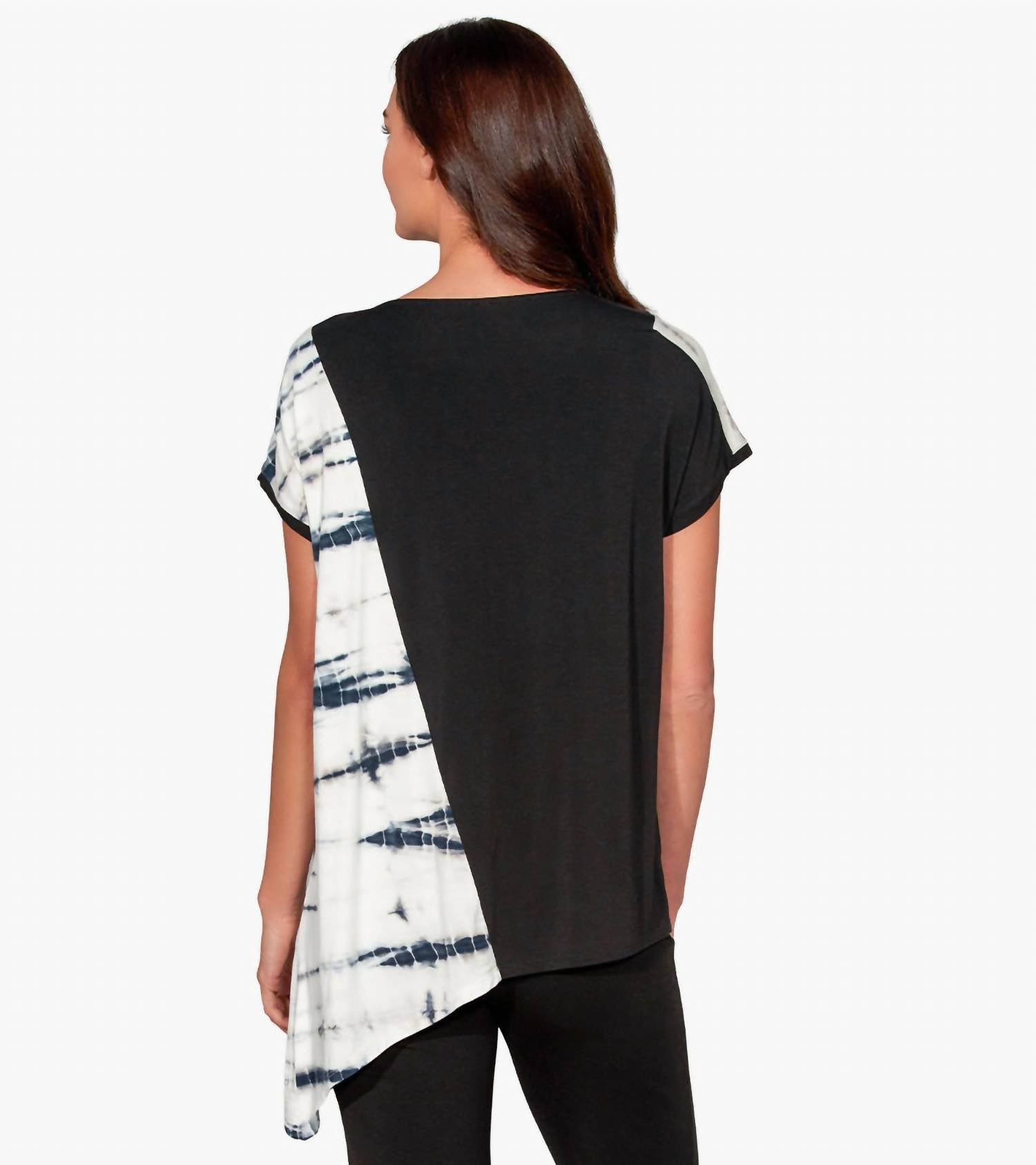 Красивая драпировка и асимметричный контрастный цветной блок в технике тай-дай из мягкого трикотажа Modal. Длина по спинке составляет примерно 25 1/2" для размера S/M. Модель ростом 5'11" носит размер S/M.