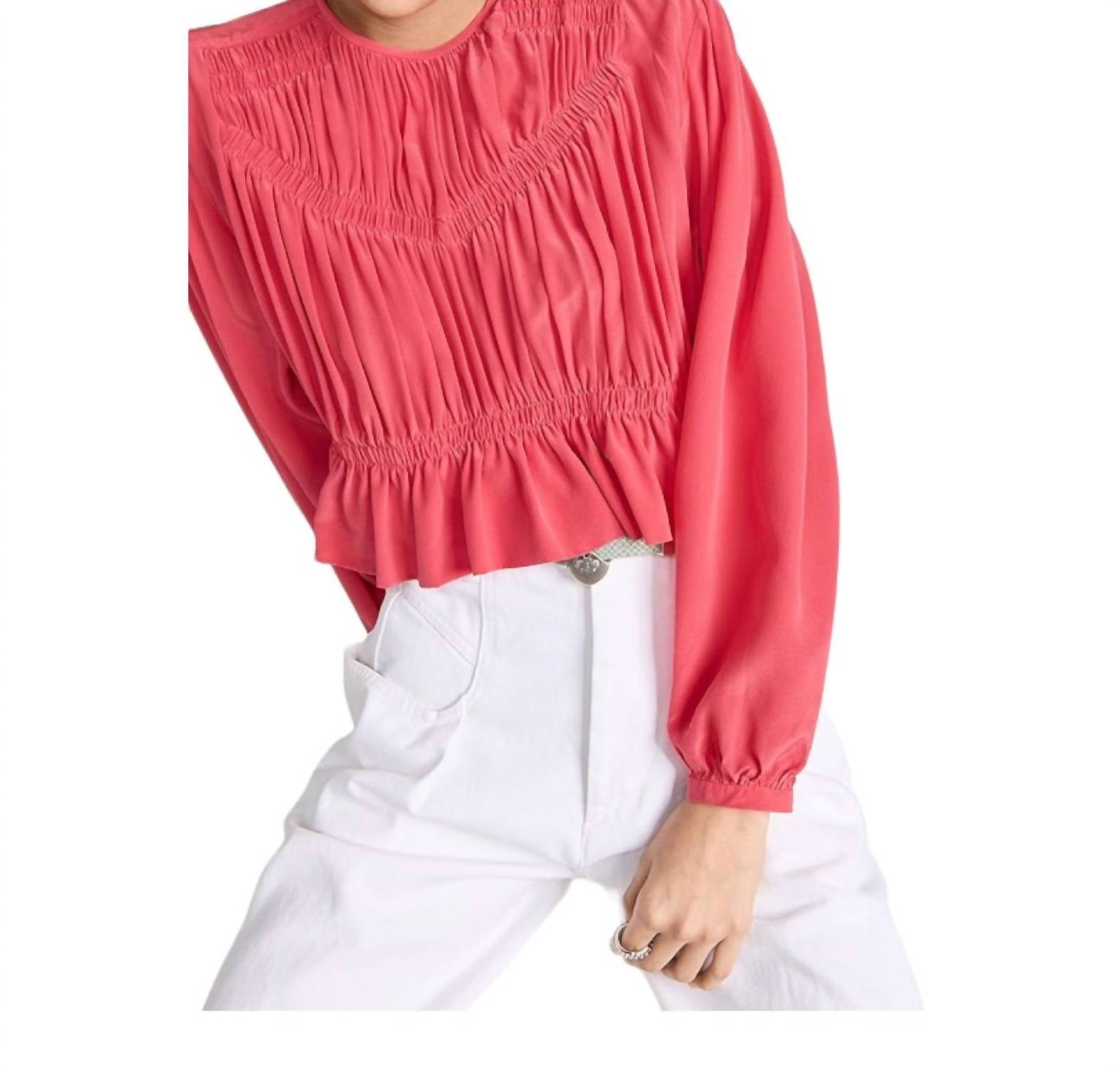 Присборенный эластичный лиф. Круглый вырез с застежкой-каплей на спине. Баска с оборкой по низу. Длинные рукава-фонарики с манжетами на пуговицах. Легкий, неэластичный шелковый креп. Химчистка. 100% шелк. Импортируется из Индии.