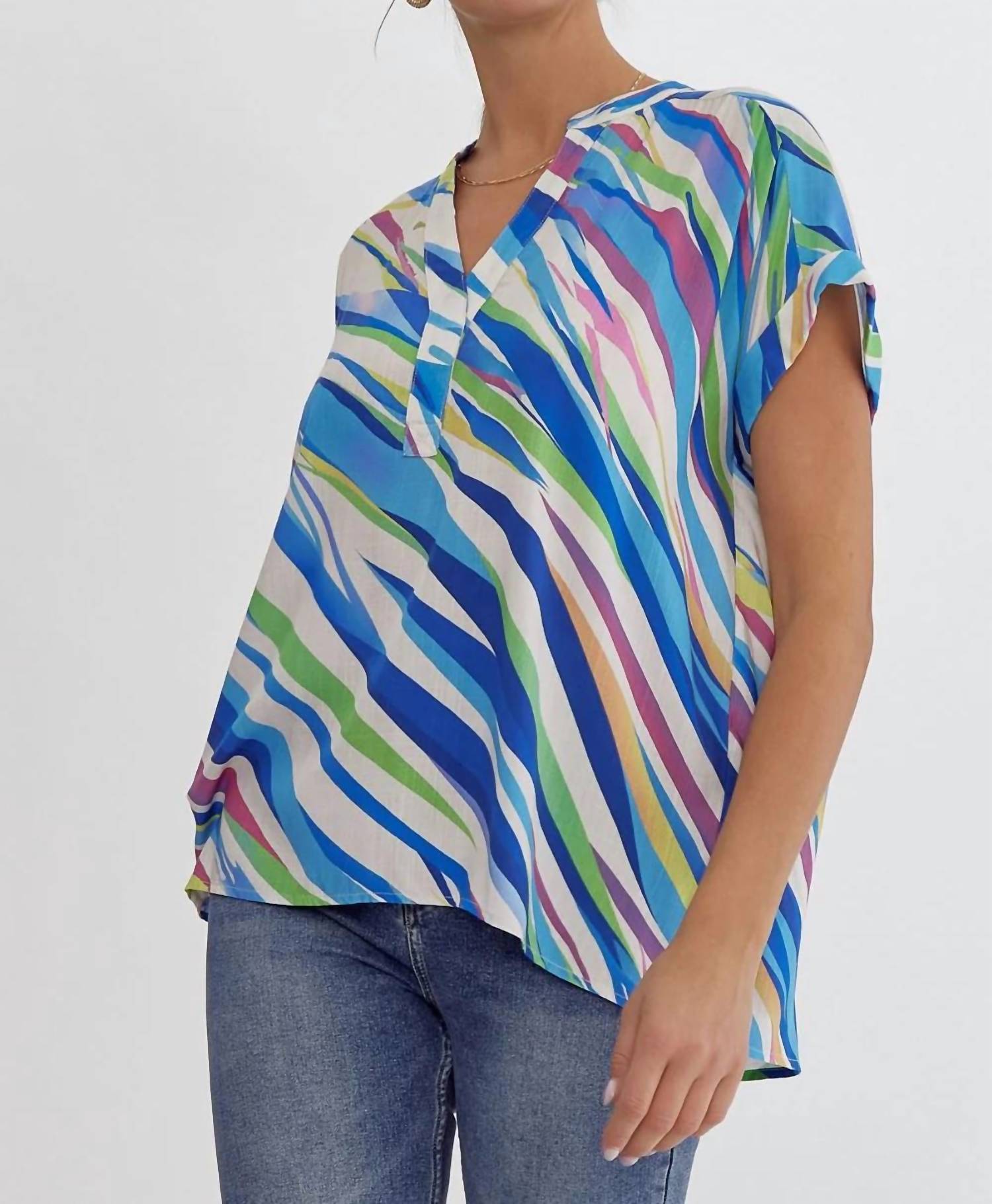Излучая смелую изысканность. Яркая синяя блузка может похвастаться потрясающим разноцветным принтом тигра. Свободный крой и постоянные закатанные манжеты. V-образный вырез. Сборки на плечах. Застежка сзади. Легкий тканый верх. Непрозрачный и дышащий. Изготовлено из 100% полиэстера. Соответствует размеру.