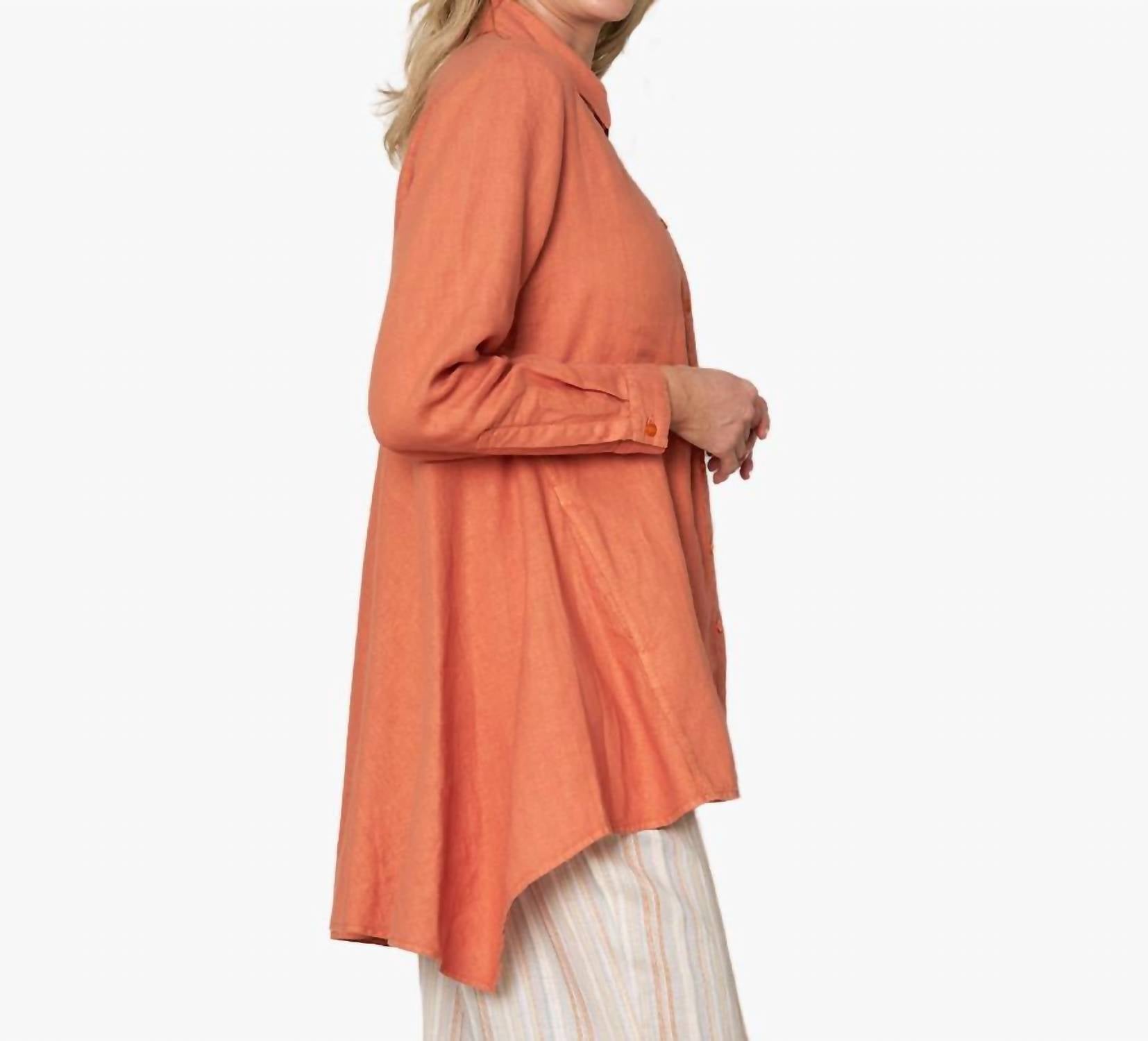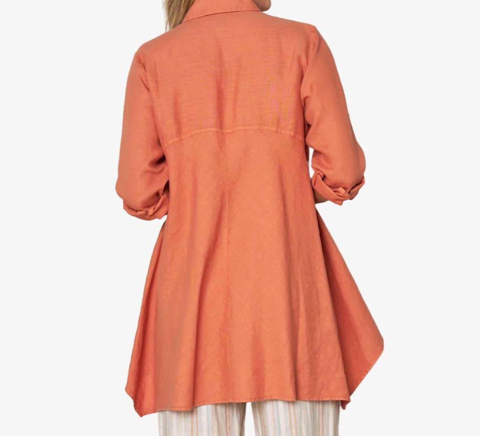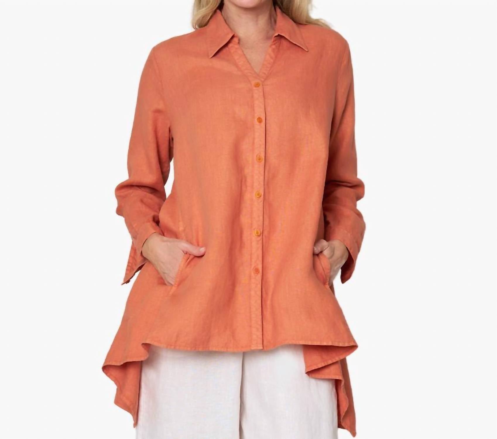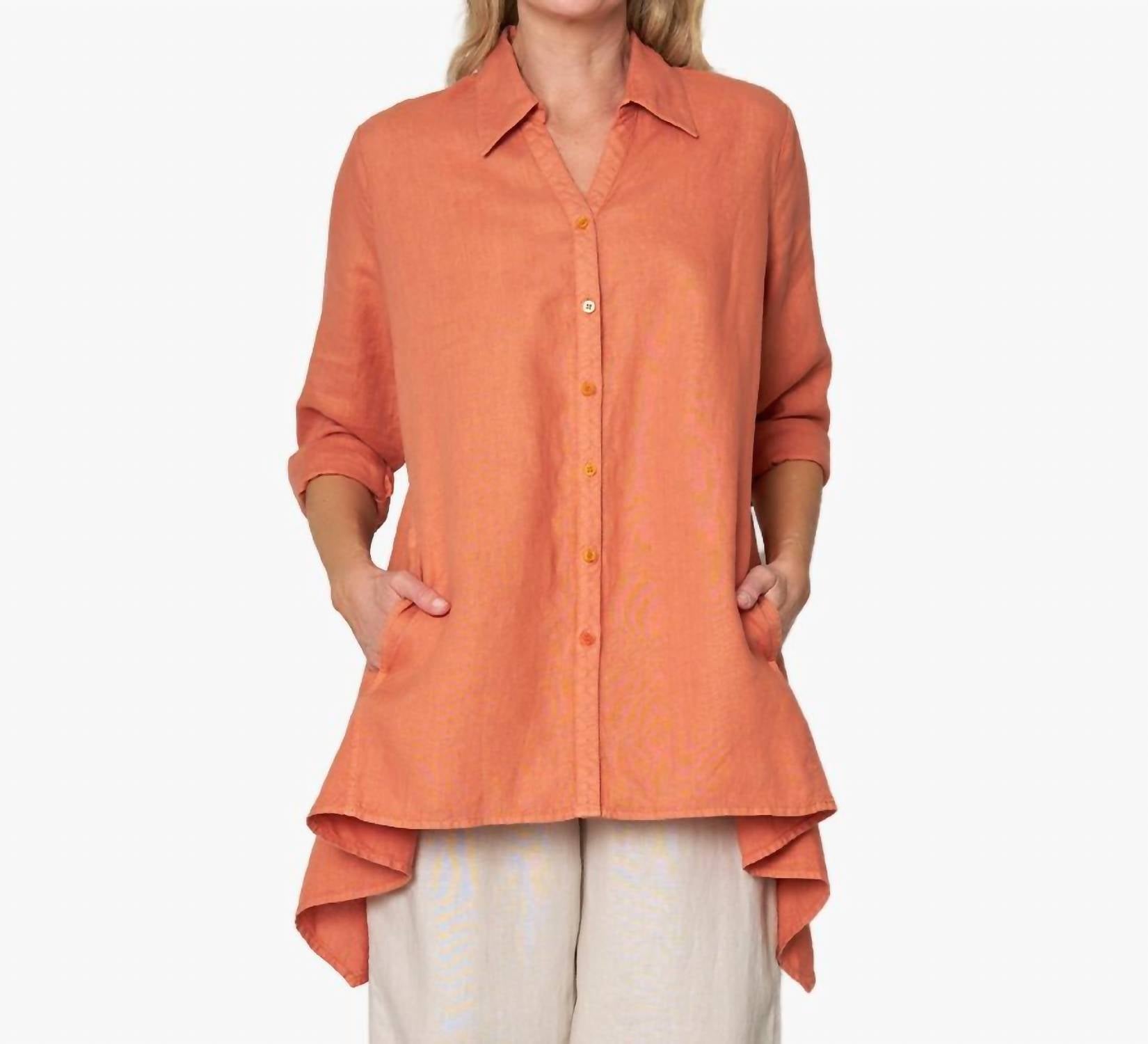Косой крой вставок. V-образный вырез и удобный А-силуэт. Карманы в швах и уникальная форма подола. Длина по спинке составляет приблизительно 31 дюйм для размера S. Модель выше ростом 5 футов 11 дюймов носит размер S. 100% лен. Импортный. Машинная стирка.