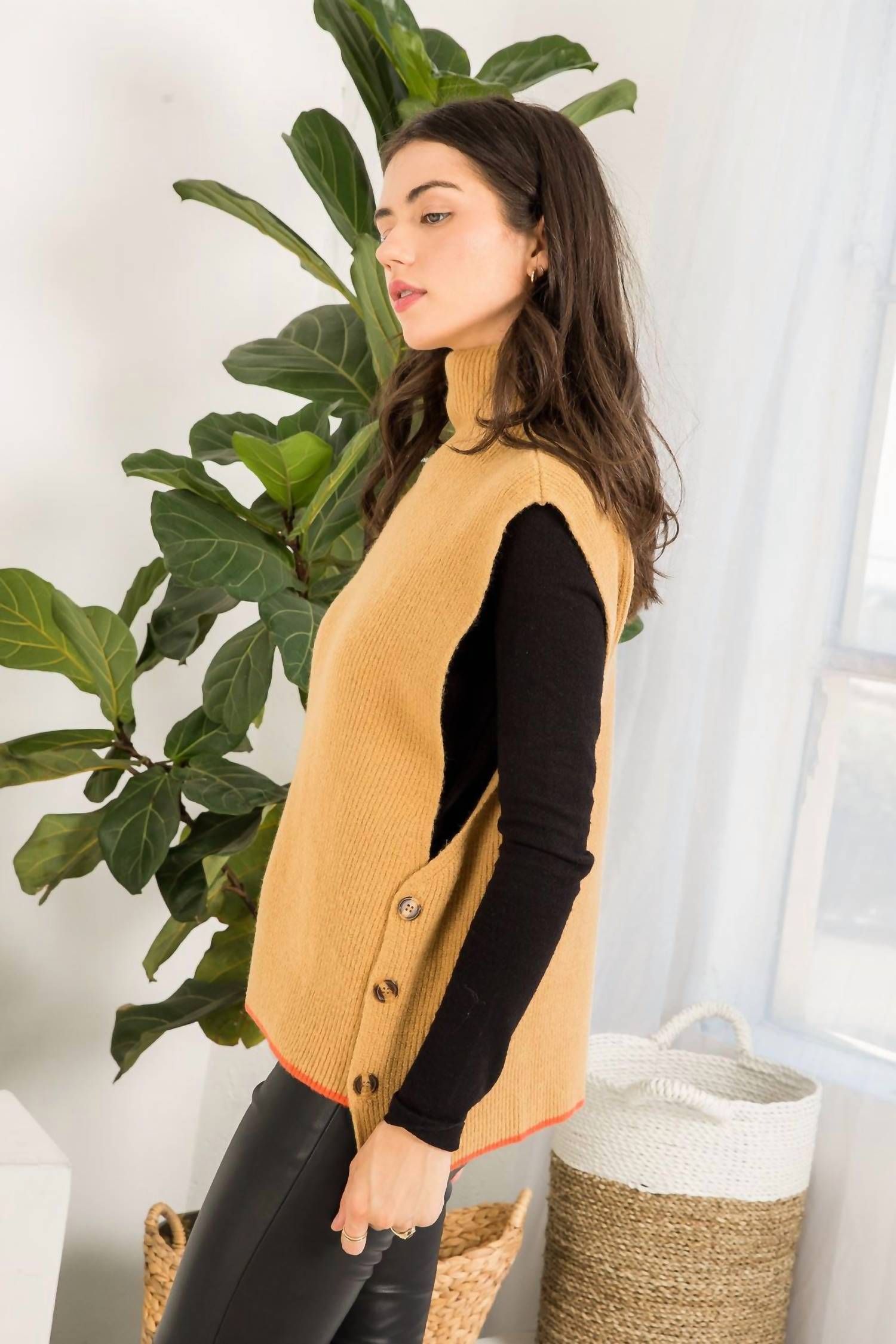 Жилеты-свитера — это новый горячий тренд! Накиньте водолазку под них, чтобы произвести впечатление на следующей праздничной вечеринке или обеде с подругами! С забавной оранжевой отделкой по низу и двумя тоновыми пуговицами по бокам этот жилет-свитер не похож ни на один другой и наверняка станет хитом этого сезона!