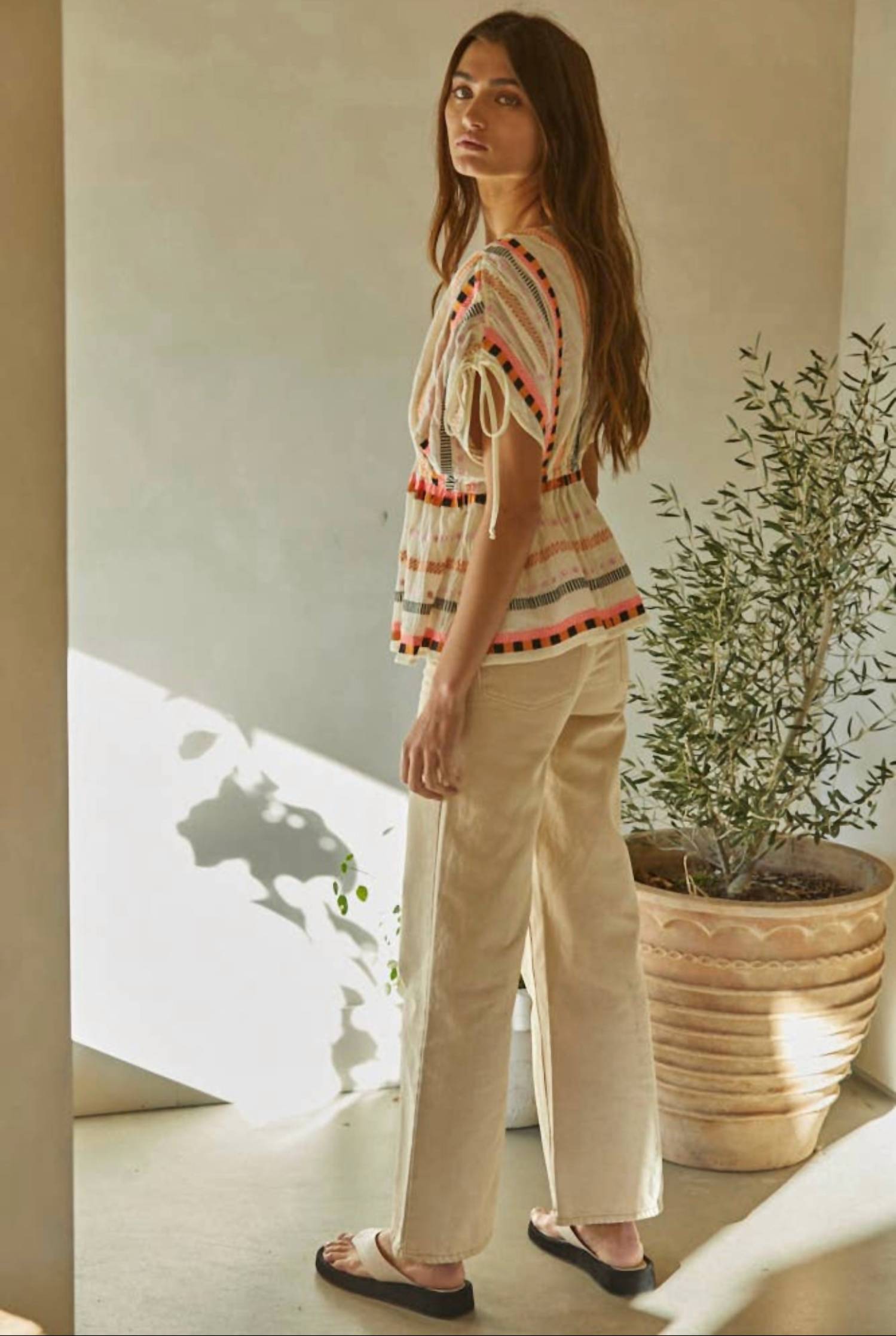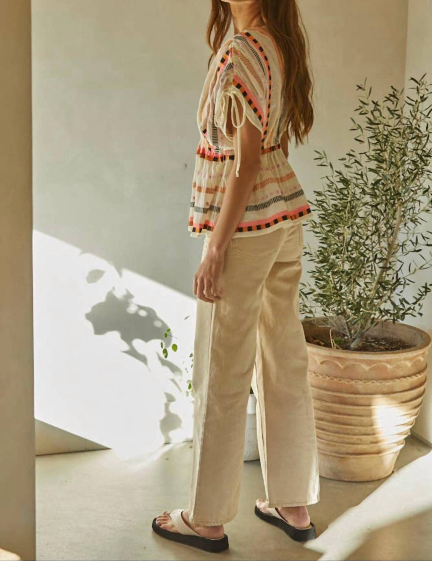 Откройте для себя топ Estella от By Together, очаровательное дополнение к вашему гардеробу в свежем белом оттенке. Эта блузка имеет рукава-крылышки и изящный V-образный вырез, выполненный из дышащей хлопковой марли для максимального комфорта. Привлеките внимание своим замысловатым вышитым узором.