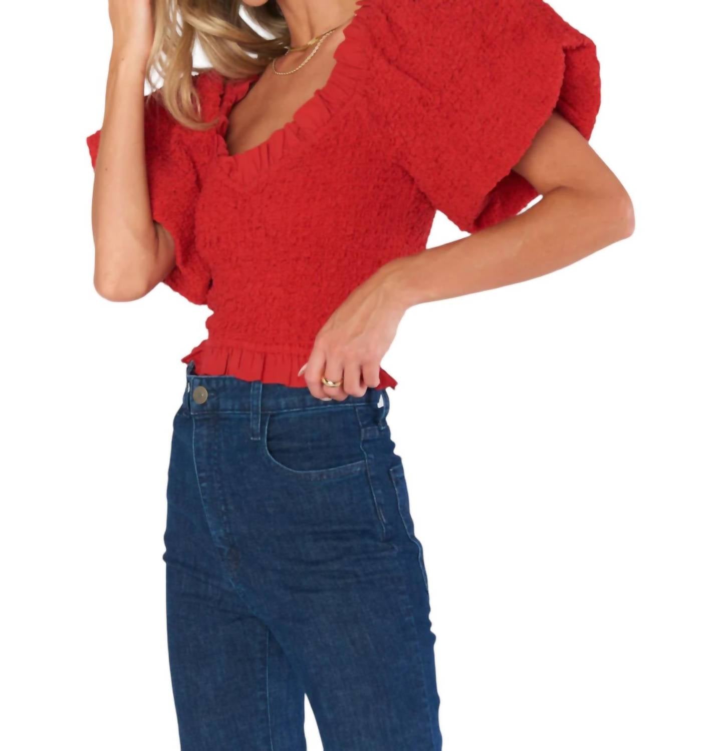 Очаровательный красный. Блузка со сборками. Спроектирована с привлекательным V-образным вырезом и отделана фактурным узором. Излучает элегантность и изысканность. Короткие рукава-фонарики и застежка на застежке. Яркий красный оттенок усиливает ее потрясающую привлекательность.