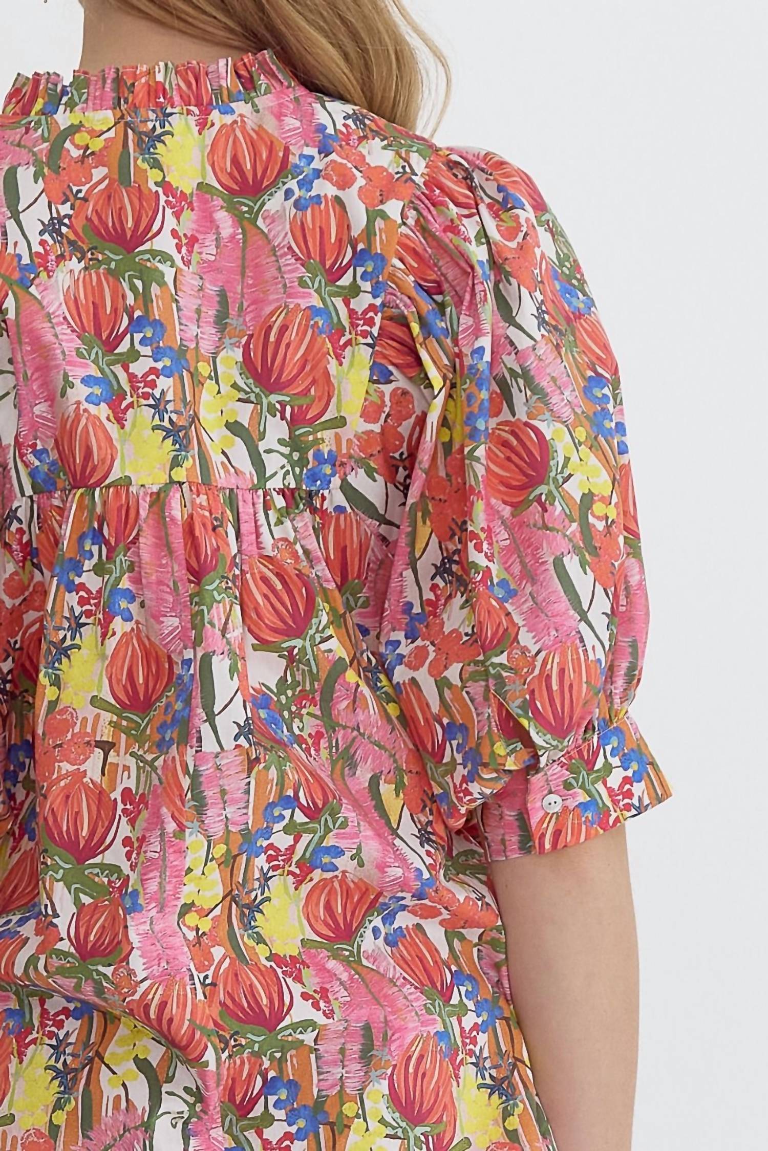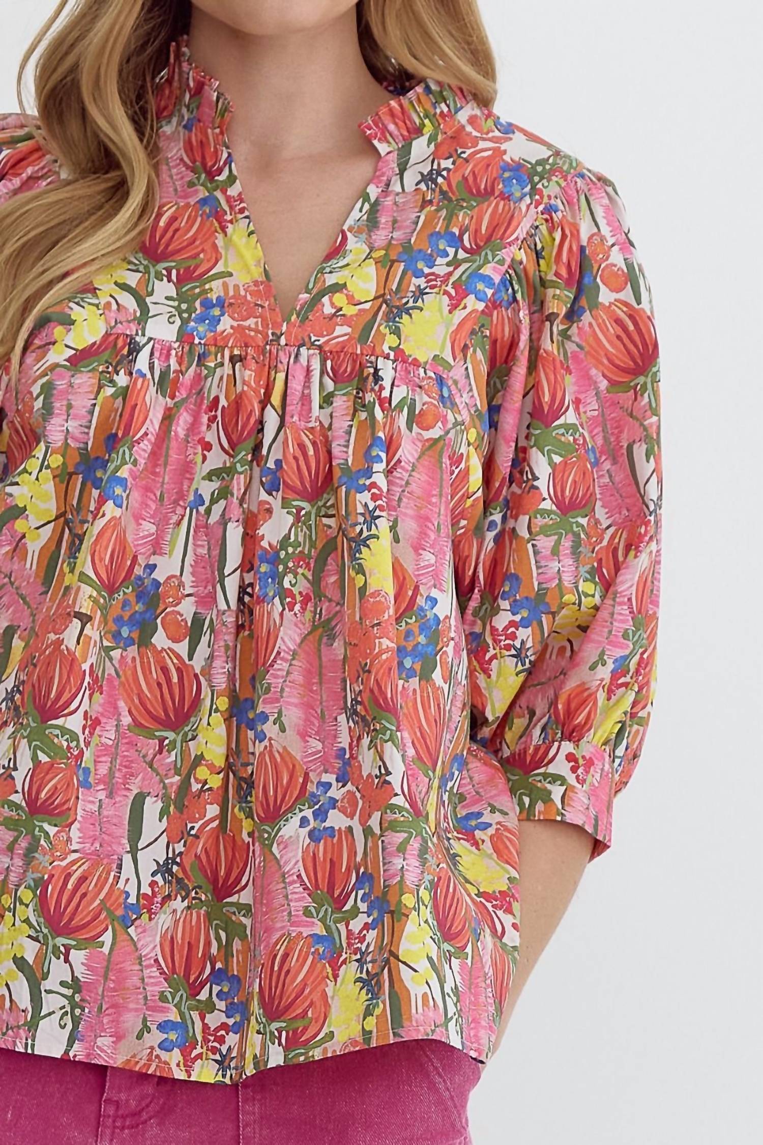 Цветочная изысканность встречается с элегантностью. Блузка с рукавами до локтя. Очаровательный V-образный вырез. Легкая, непрозрачная тканая композиция. Нежный цветочный принт. Застежка на пуговицы на манжете обеспечивает утонченную деталь. Стиль надевания. Пример гармоничного сочетания стиля и удобства.