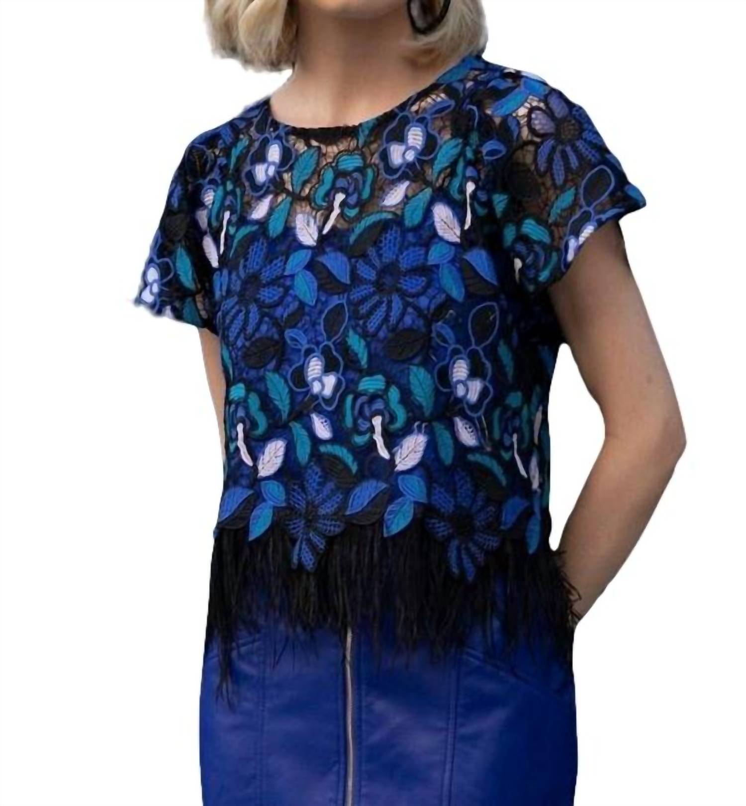 Этот великолепный кружевной топ с короткими рукавами и отделкой из черных перьев делает удобный и в то же время шикарный стиль по-настоящему непринужденным. Отделка из перьев. Короткий рукав. Круглый вырез. Стиль пуловера