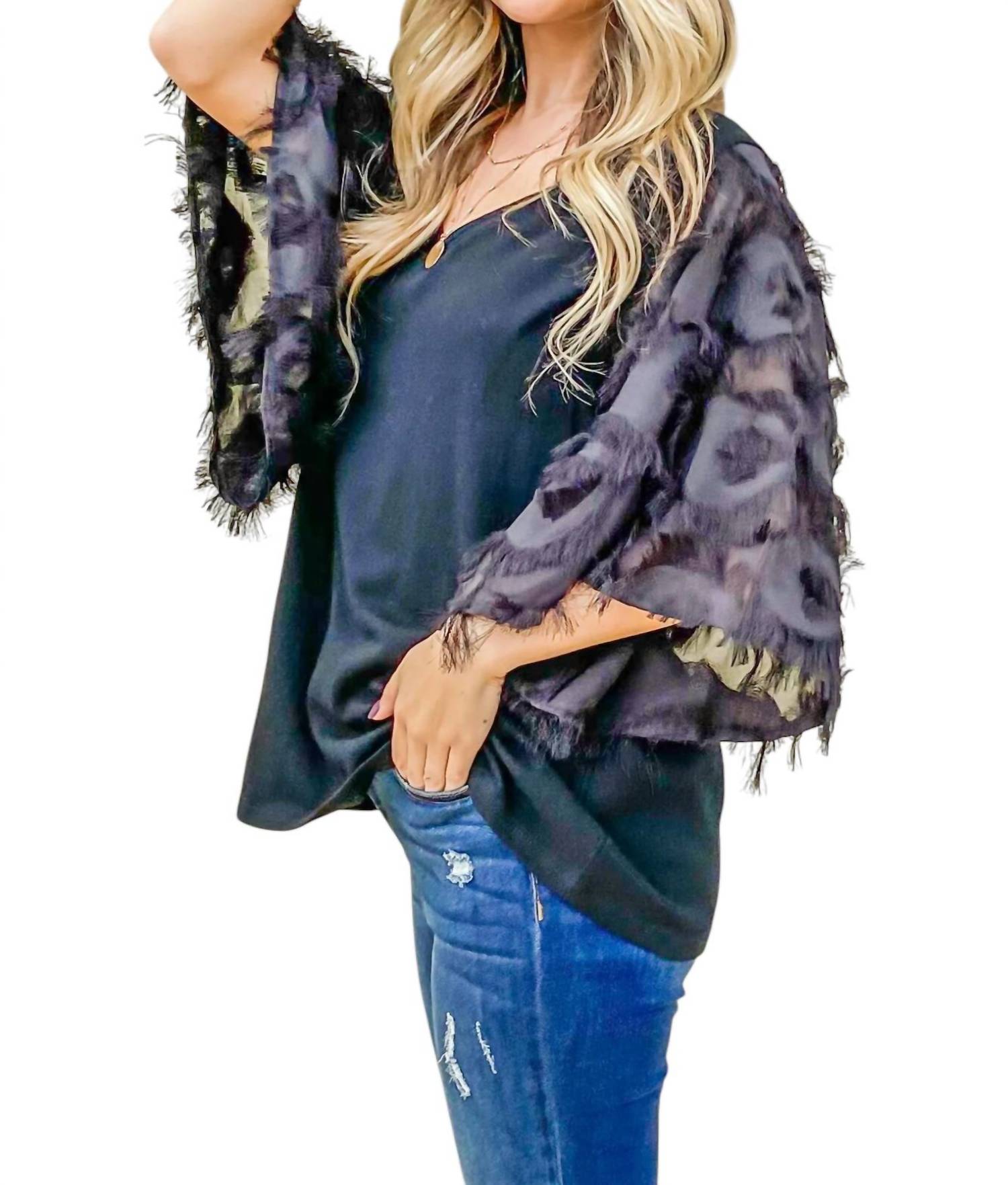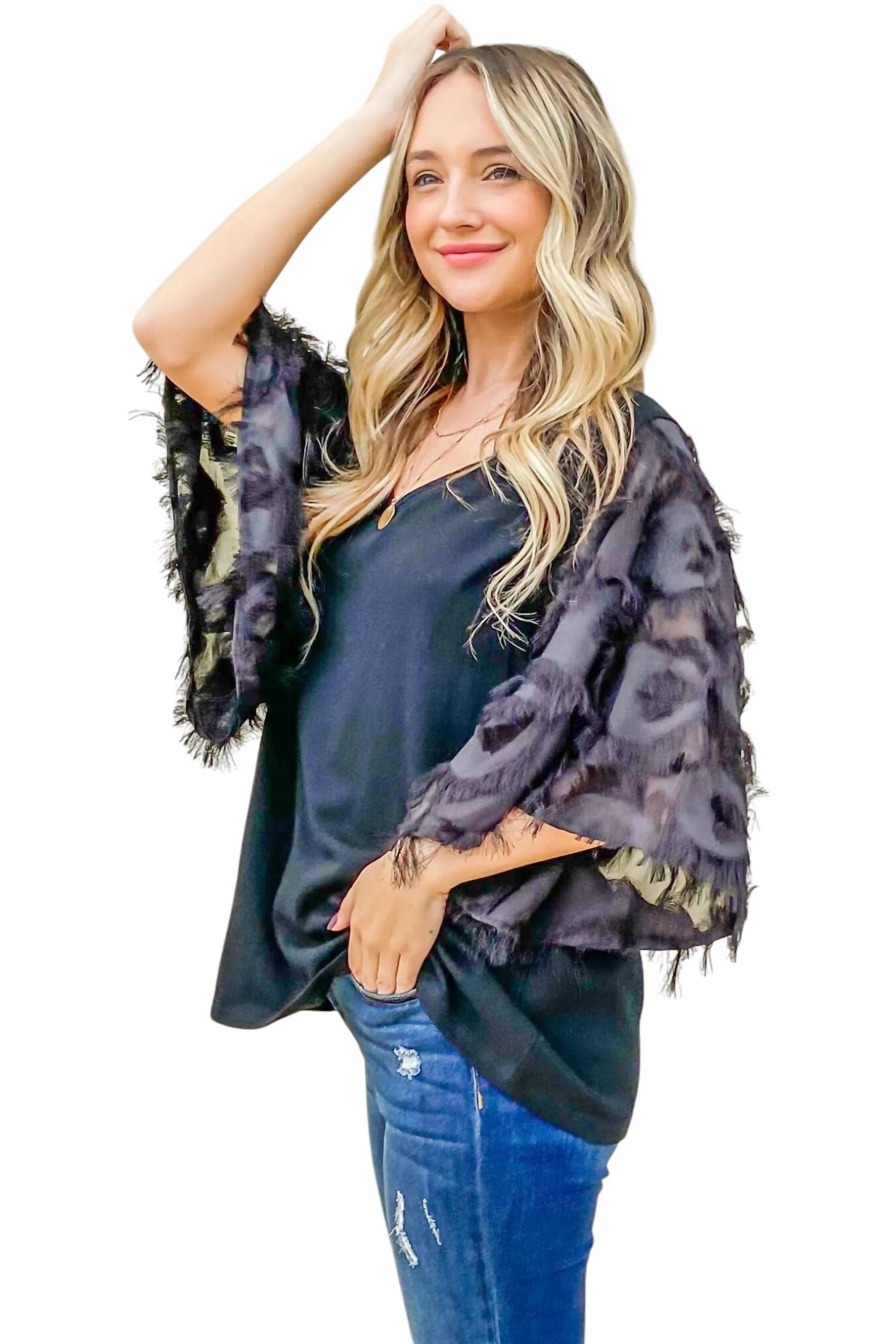Этот топ изготовлен из легкого и воздушного трикотажного материала с узким плетением, с рукавами-колокольчиками 3/4 с перьевыми деталями и свободным кроем. Изготовлен из 95% полиэстера и 5% спандекса, с контрастной тканью из 100% полиэстера.