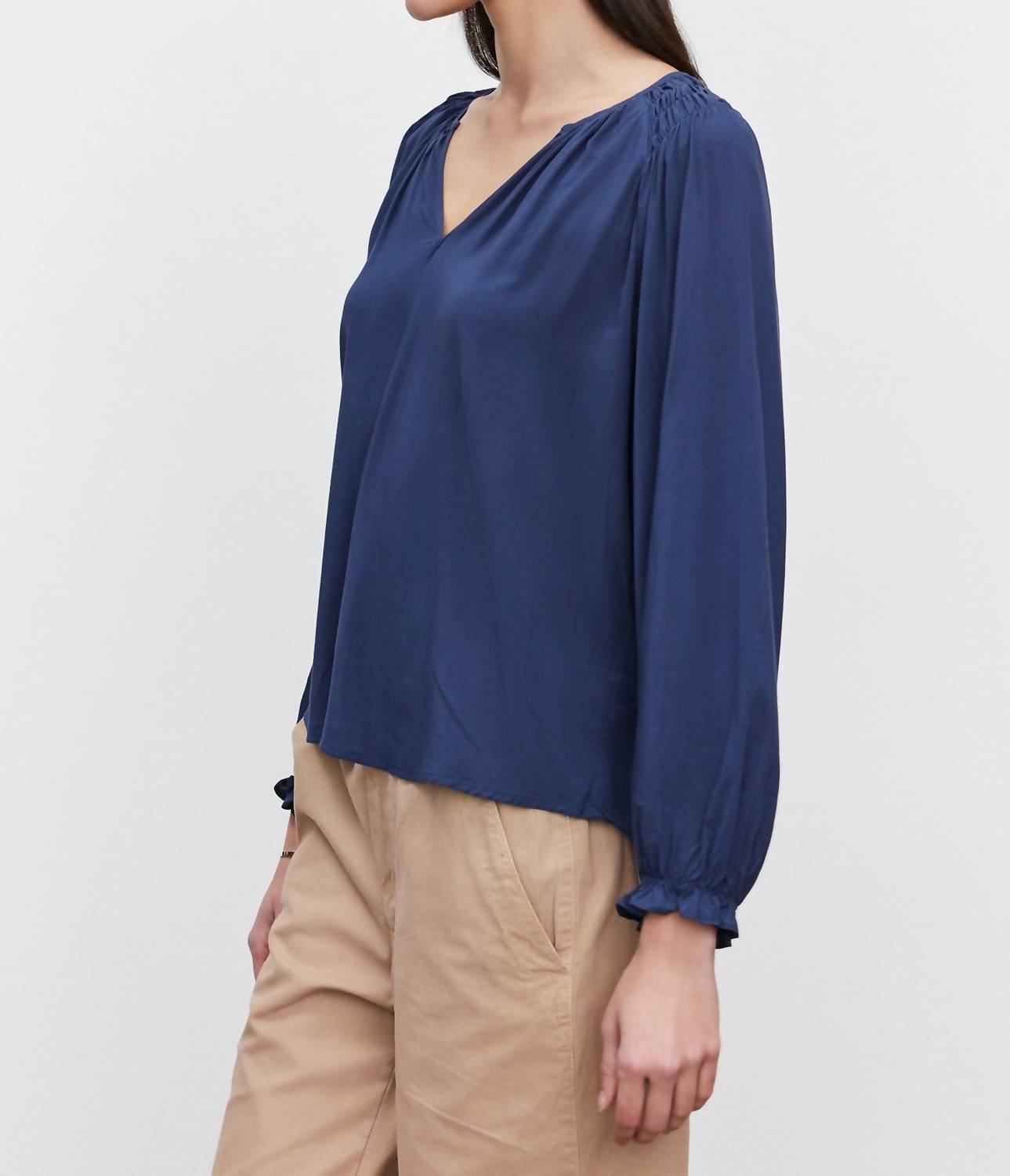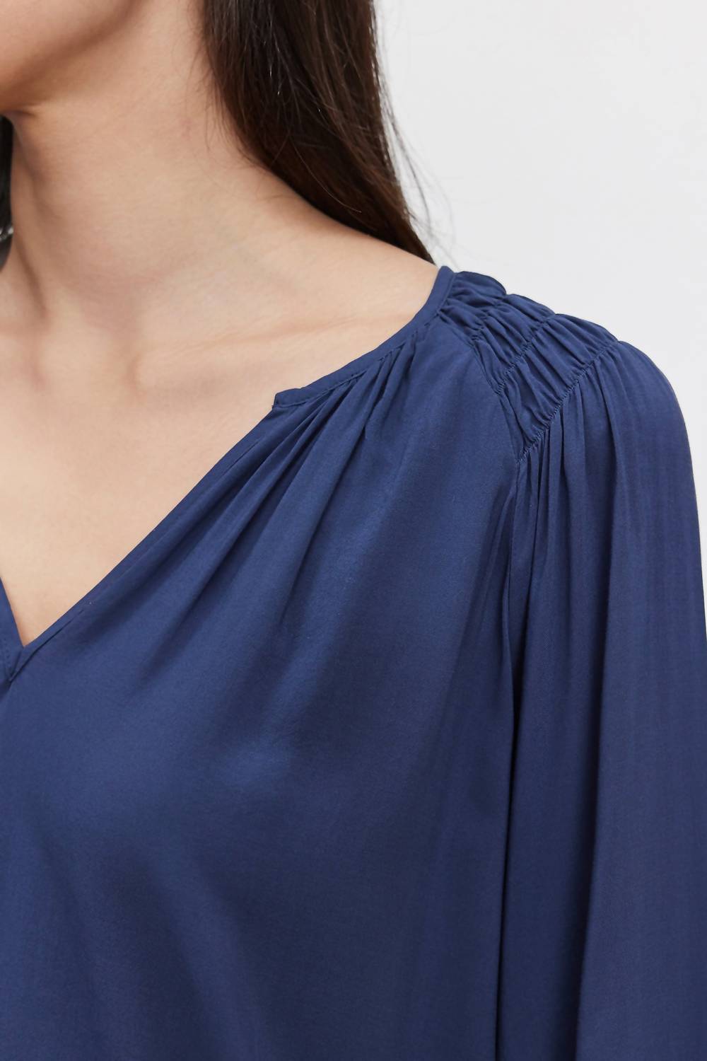 Эта однотонная блузка имеет длинные рукава с эластичными манжетами-оборками и очаровательно присборенные плечи. Изготовлена из 100% вискозы, ее натягивающийся фасон дополнен овальным подолом и изящным V-образным вырезом. Инструкции по машинной стирке и сушке на веревке.