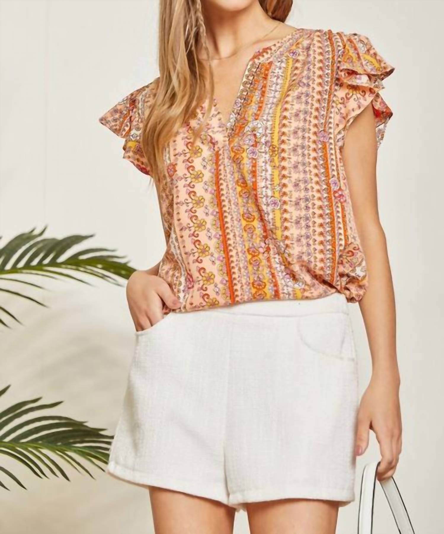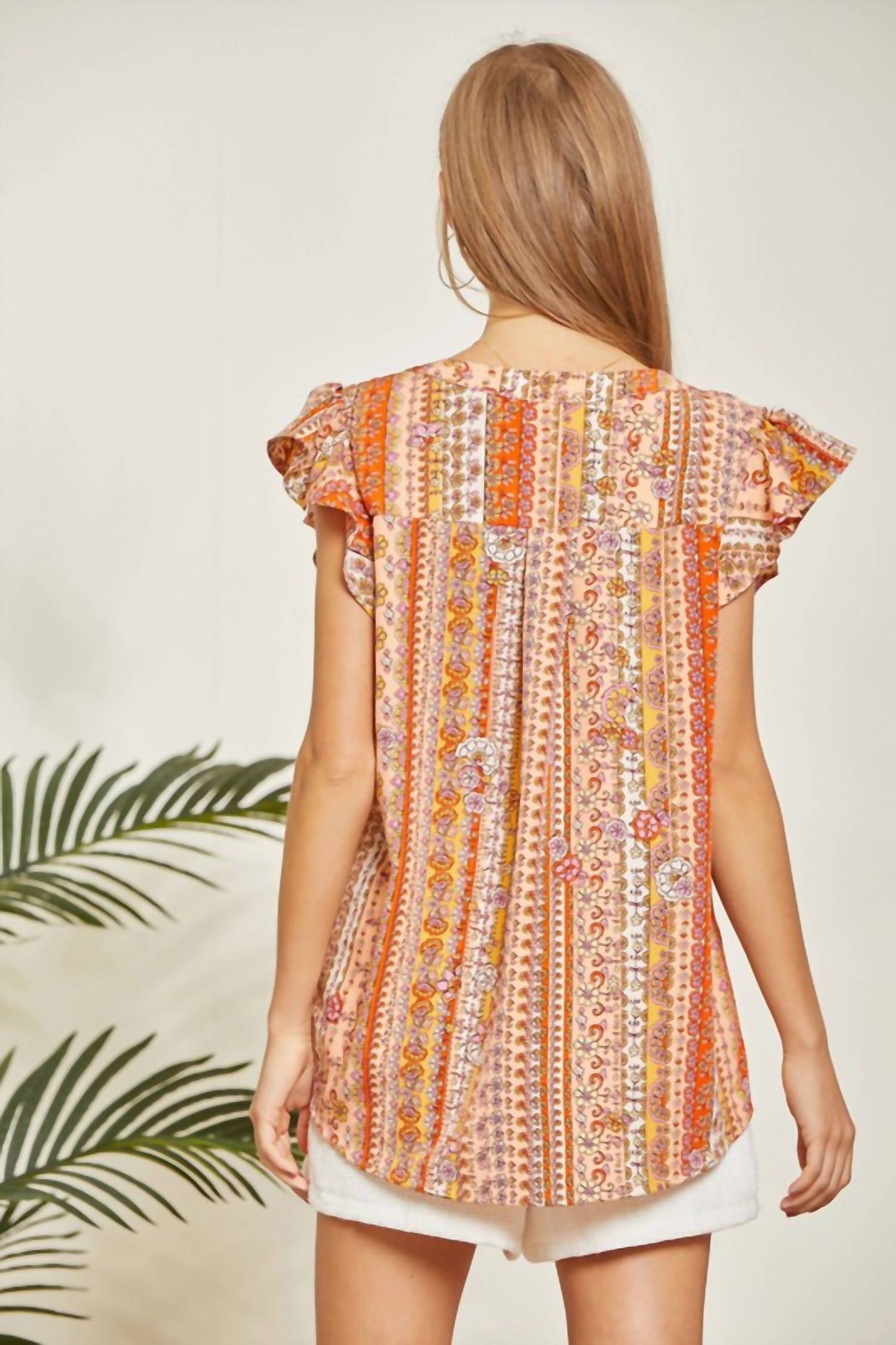 Яркий и пленительный оранжевый цветочный узор. Демонстрирует рукава-крылышки и стильный V-образный вырез. Предлагает удобную и выгодную посадку. Изготовлено из 100% полиэстера. Непрозрачный верх имеет удобную застежку-липучку.