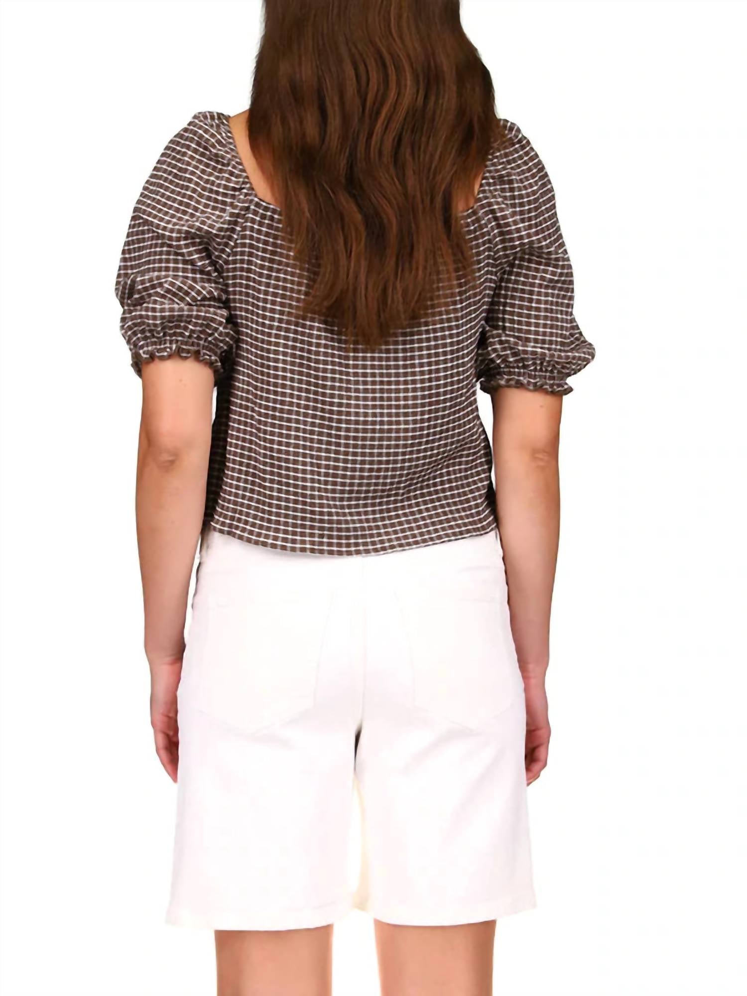 Нам нравятся его рукава-фонарики, квадратный вырез и узор в клетку! Сочетайте его с джинсами или надевайте поверх любимой макси-юбки. Такой универсальный, такой красивый!