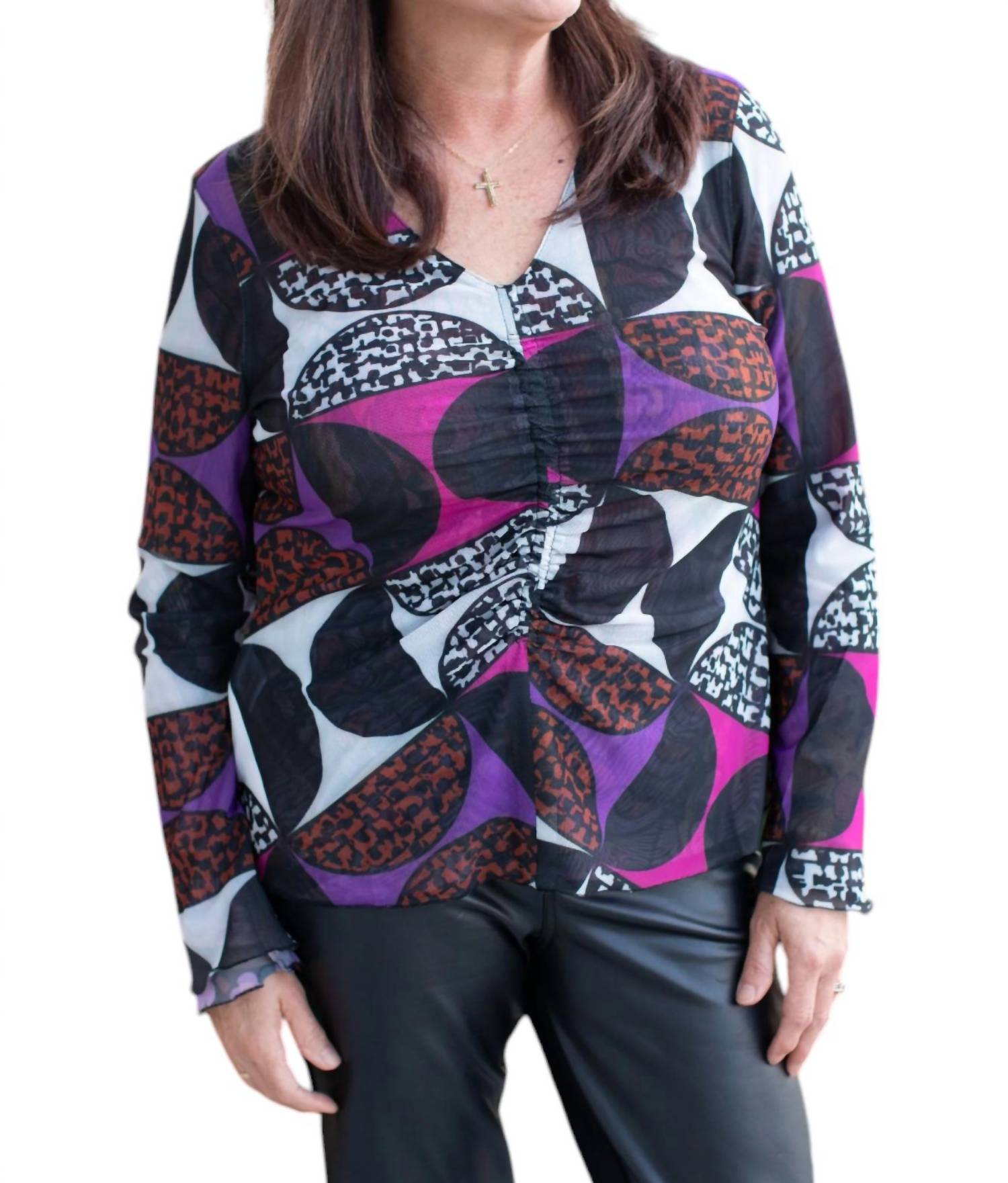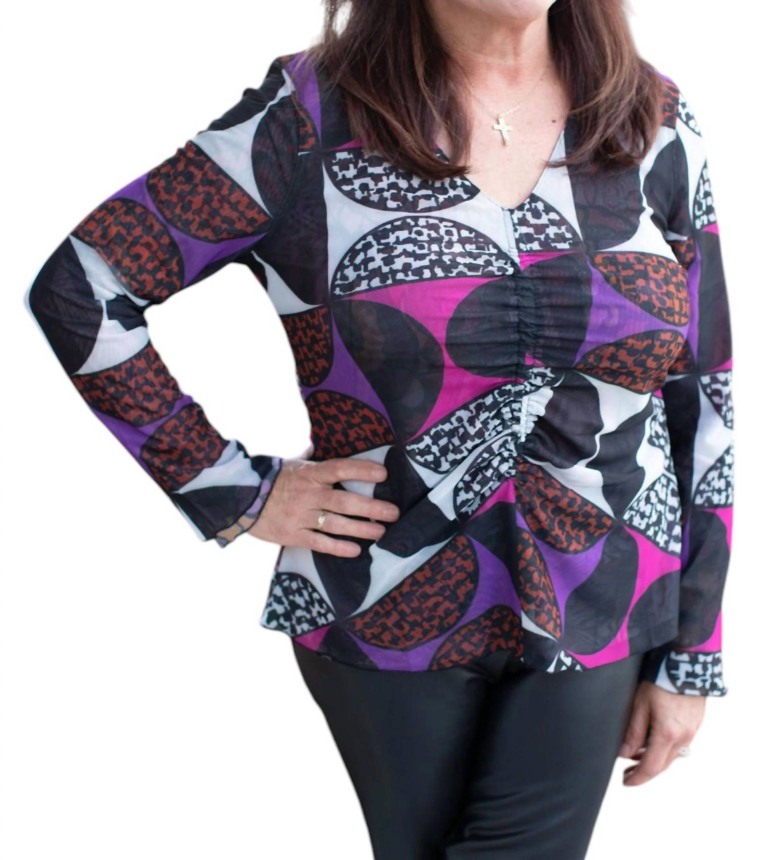 Универсальность и яркий стиль благодаря разноцветному узорчатому дизайну. Длинные рукава и привлекательный V-образный вырез. Легкий и дышащий. Наслаждайтесь двумя разными образами в одном топе. Двусторонняя натура и уникальная отделка сборками, которая простирается на 3/4 вниз по обеим сторонам. Изготовлен с удобной застежкой-липучкой.