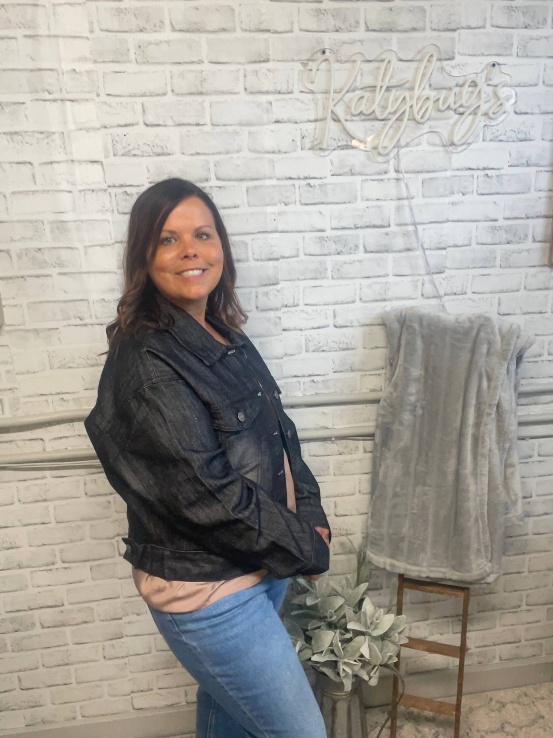 Эта джинсовая куртка предлагает удобную растяжку, длинные рукава, воротник и пуговицы спереди. Она сделана из 100% хлопка и имеет длину 22" (маленькая).