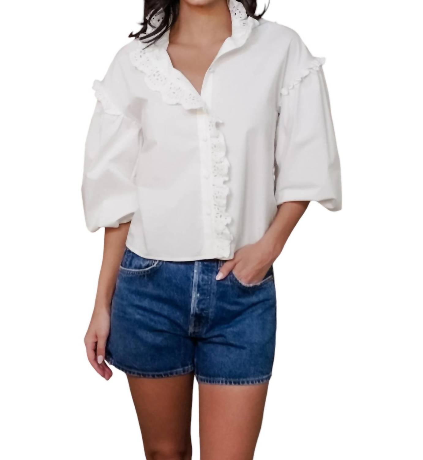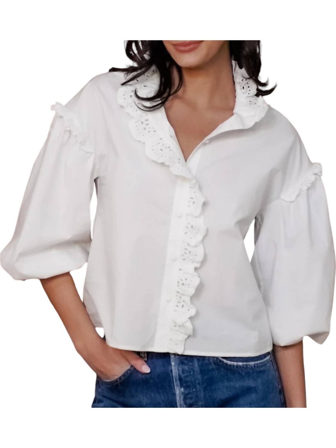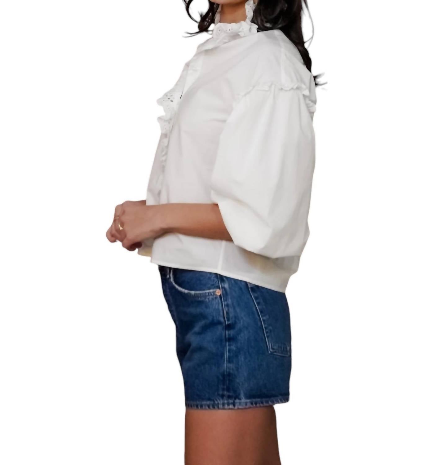 Изготовлено из фирменного хрустящего хлопкового поплина. Идеально сочетает в себе вневременную элегантность и современный стиль. Свободный силуэт обеспечивает непринужденную, но изысканную посадку. Романтичная вышивка с оборками украшает шею, плечи и планку. Передняя застежка бесшовно отделана пуговицами, обтянутыми тканью. Подчеркивает изысканную эстетику топа. Универсальная застежка на пуговицы. Только сухая чистка для поддержания его в идеальном состоянии.