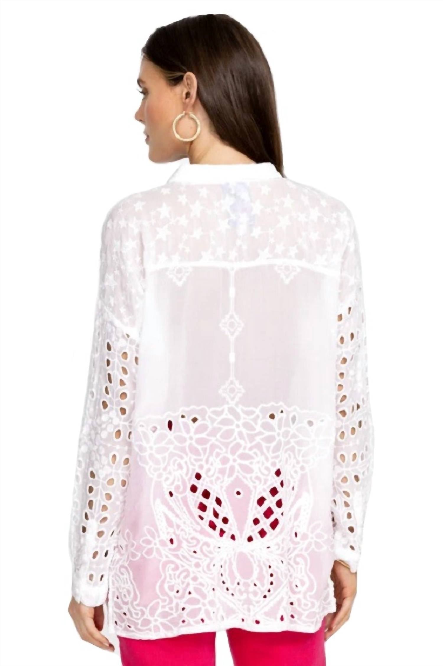 Эта рубашка на пуговицах изготовлена из удобного вискозного шелка и может похвастаться воротником, длинными рукавами, дополняющим сочетанием нежных узоров и выделяющимся вышитым дизайном вдоль рукавов. 100% вискоза. Обтянутые нитками пуговицы. Размеры для размера Medium - Длина - 28 3/4", Бюст - 47 1/2". Машинная стирка только в холодной воде. Отбеливатель без хлора при необходимости. Сушить в стиральной машине при низкой температуре. Гладить теплым утюгом.