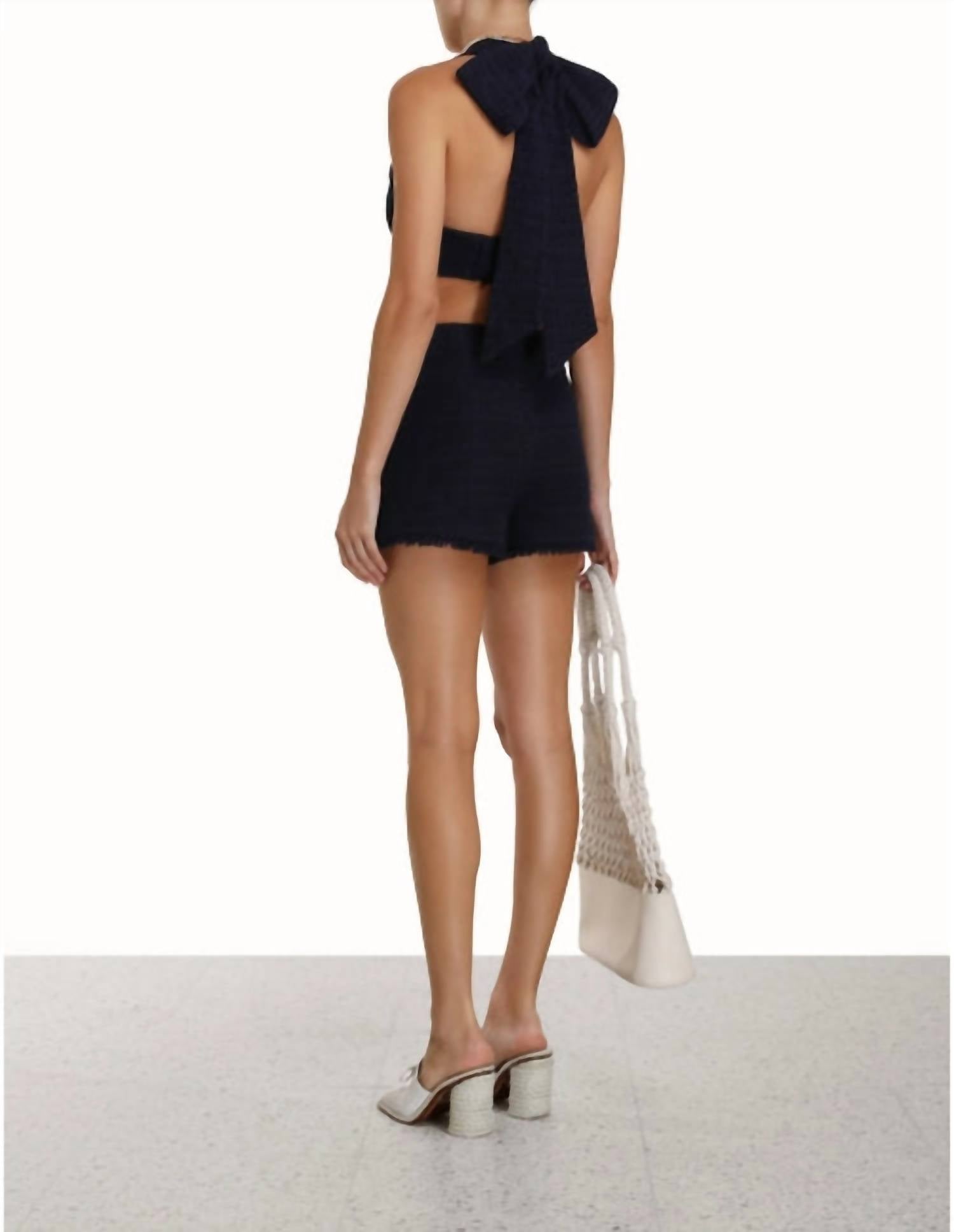 Твидовые шорты с высокой талией и карманами в боковых швах, отделанные бахромой по подолу. 83% хлопок, 10% вискоза, 7% полиамид. Австралийские размеры. Соответствуют размеру. Удобный и свободный крой.