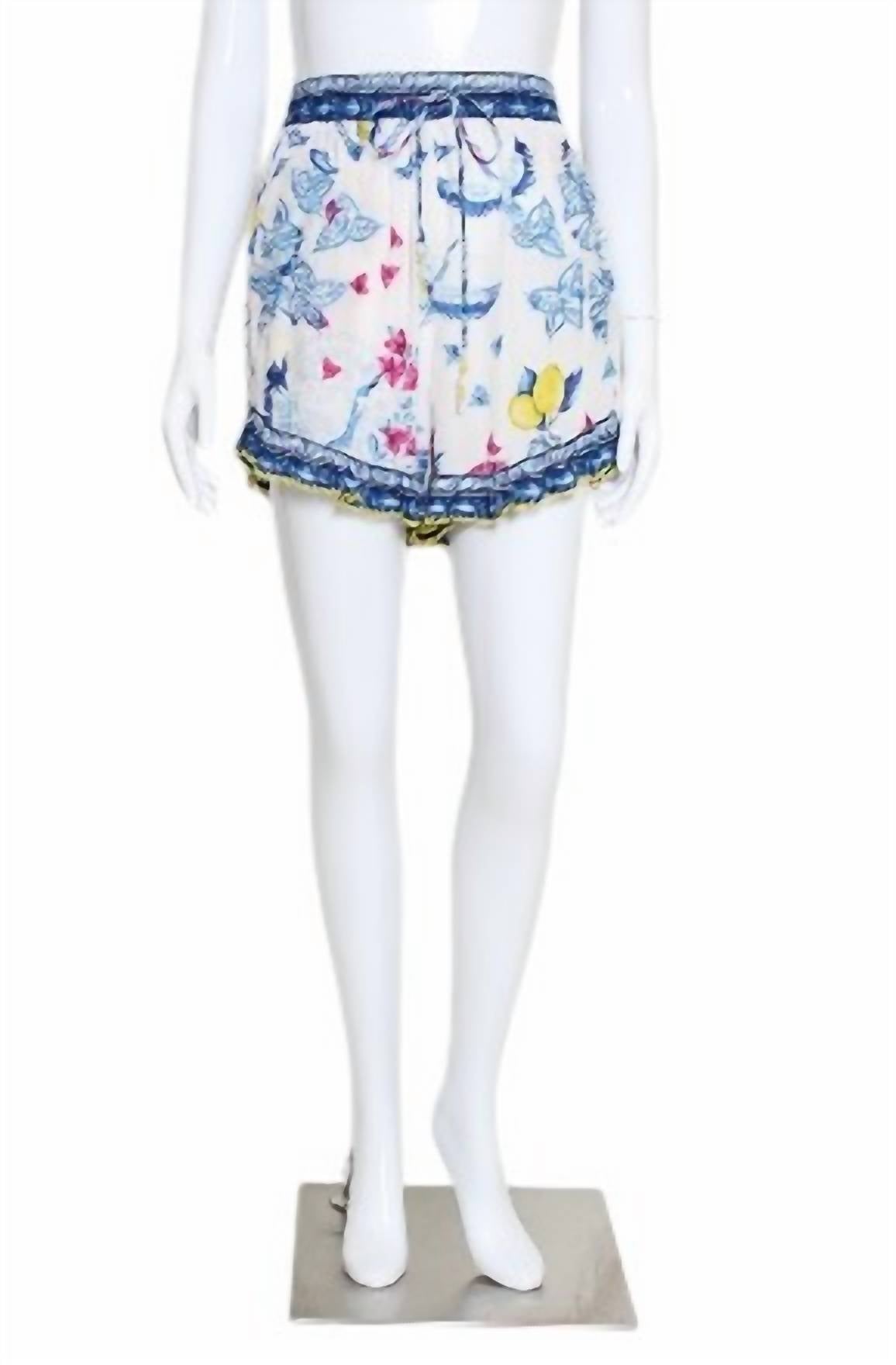 Представляем шорты Candice Shorts by TAJ by Sabrina Crippa, элегантную модель с высокой талией, украшенную узором Blue Greek Birds. Эти женские шорты имеют регулируемый пояс с завязками, что делает их одновременно стильными и удобными.