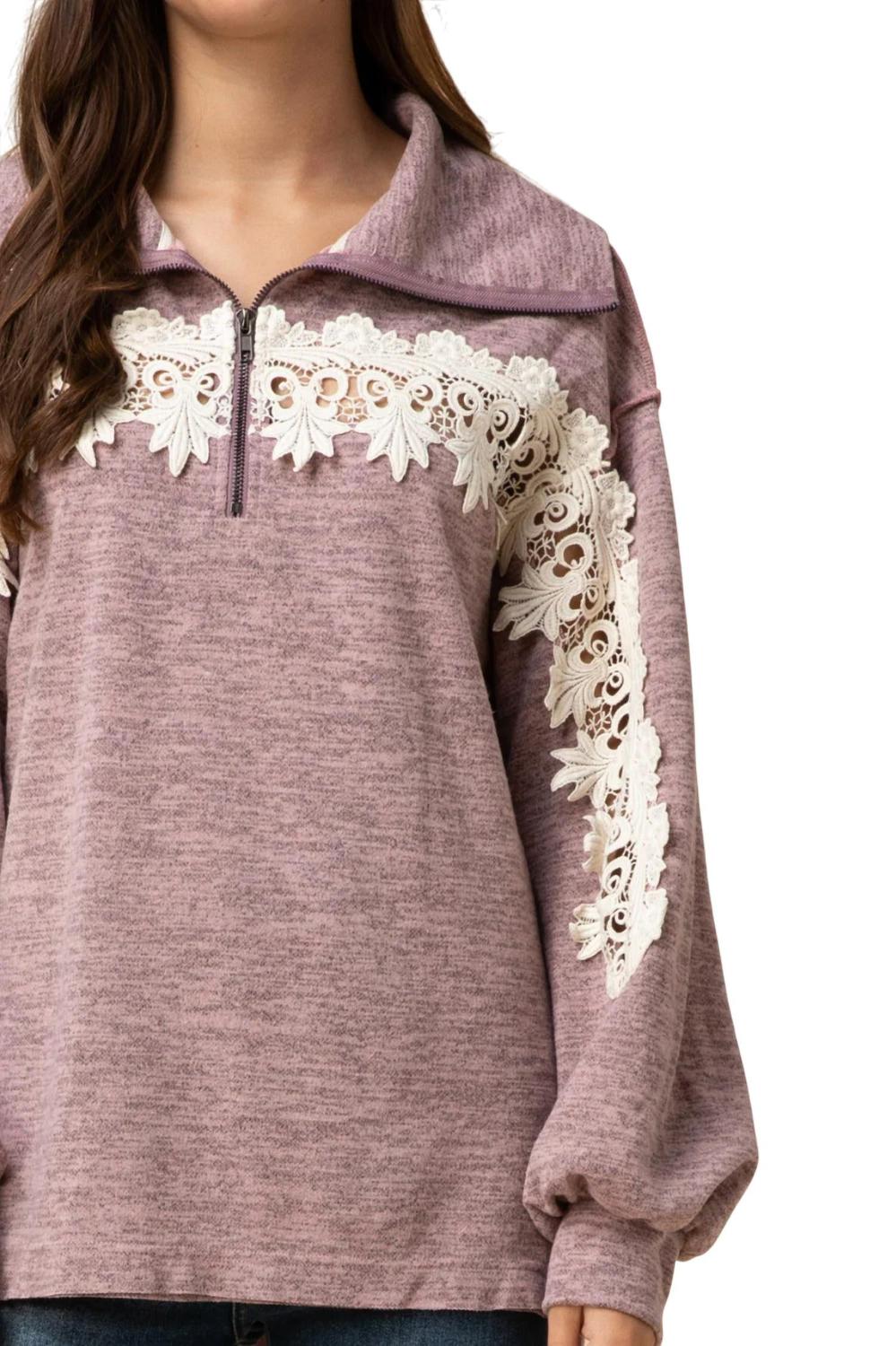 Застежка-молния 1/4 на горловине, длинные рукава-фонарики, прозрачное кружево крючком, боковые разрезы, приподнятые швы и силуэт полного кроя. Эта толстовка легкая. Small - бюст 42" Длина 28", Medium - бюст 44" Длина 28", Large - бюст 46" Длина 28". 90% полиэстер, 10% спандекс. Ручная стирка в холодной воде.