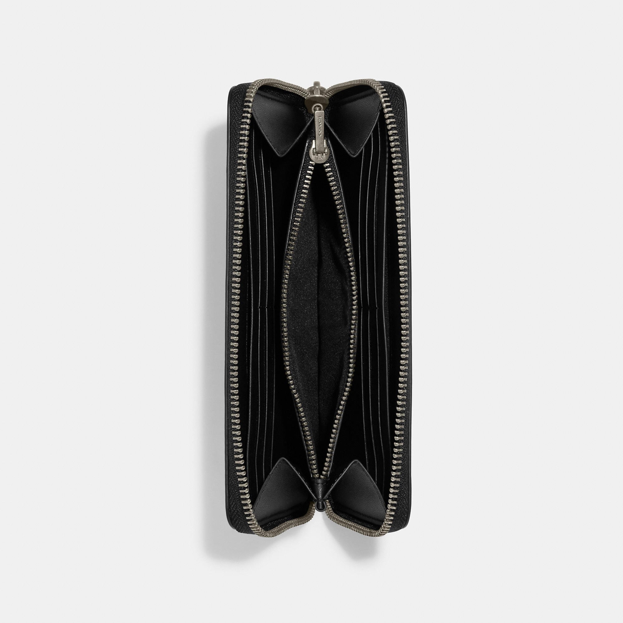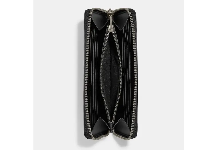 Гладкая телячья кожа фирменного покроя 12 отделений для кредитных карт Полноразмерные отделения для купюр Карман для монет на молнии Застежка-молния по периметру 7 1/2 (Д) x 4 (В) x 3/4 (Ш) Подходит для всех размеров телефонов вплоть до iPhone X и Samsung S7 Edge Модель № CE551 | Coach Outlet Кошелек-гармошка из фирменной кожи - черный