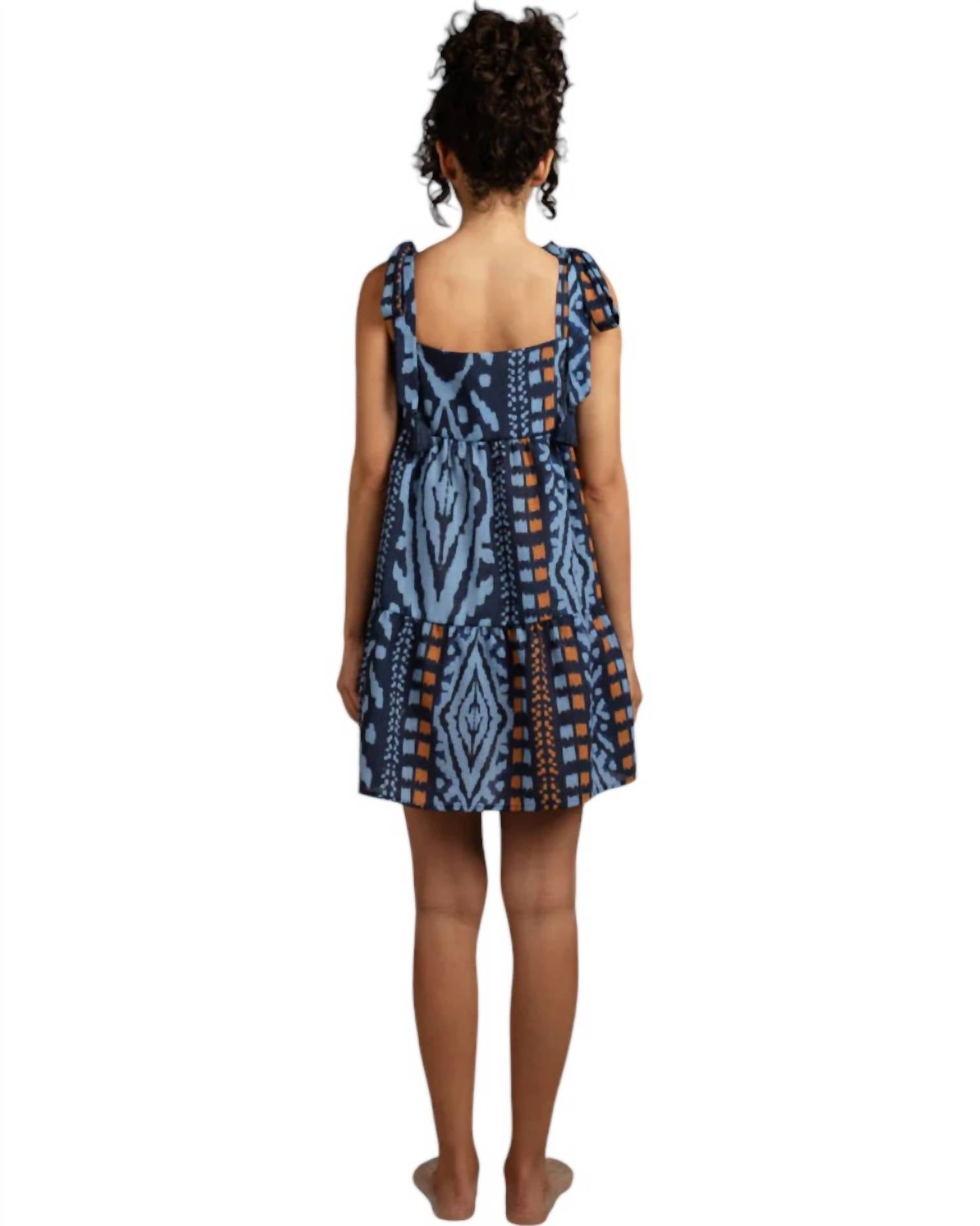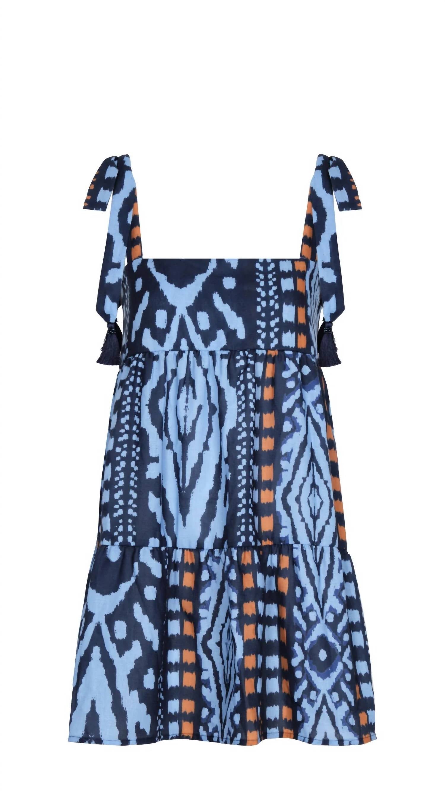 Очарование и элегантность. Изысканное мини-платье синего цвета с пленительным узорчатым принтом. Прямой квадратный вырез красиво обрамляет декольте. Регулируемые бретели обеспечивают индивидуальную посадку для максимального комфорта. Декоративные кисточки придают игривый, но шикарный вид. Изготовлено по силуэту платья-рубашки. Чудо без рукавов обеспечивает свободу и легкость движений. Легко сочетает современные тенденции с вечной красотой.