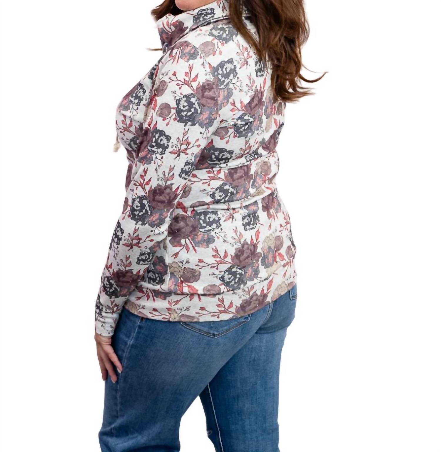 Яркий многоцветный цветочный рисунок. Длинные рукава. Воротник-хомут с завязкой. Тройной эластичный материал. 95% хлопок, 5% спандекс. Соответствует размеру.