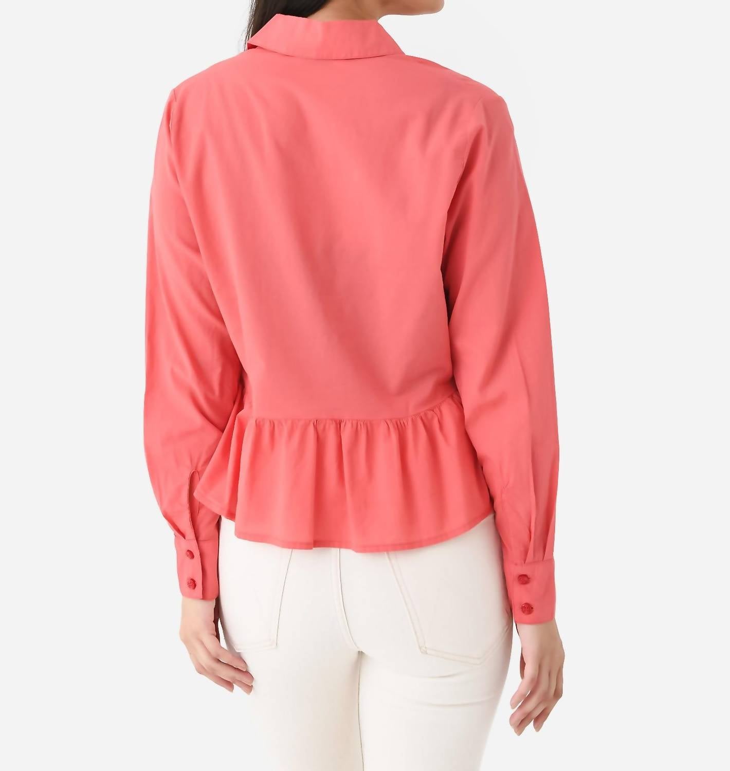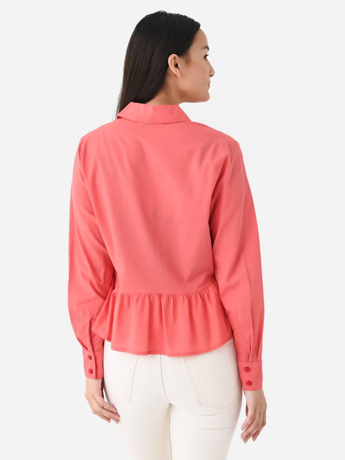 Легкий хлопковый топ с отложным воротником, потайной планкой на пуговицах, манжетами на пуговицах и очаровательным оборчатым подолом. Изготовлен из 100% хлопка для классической посадки.