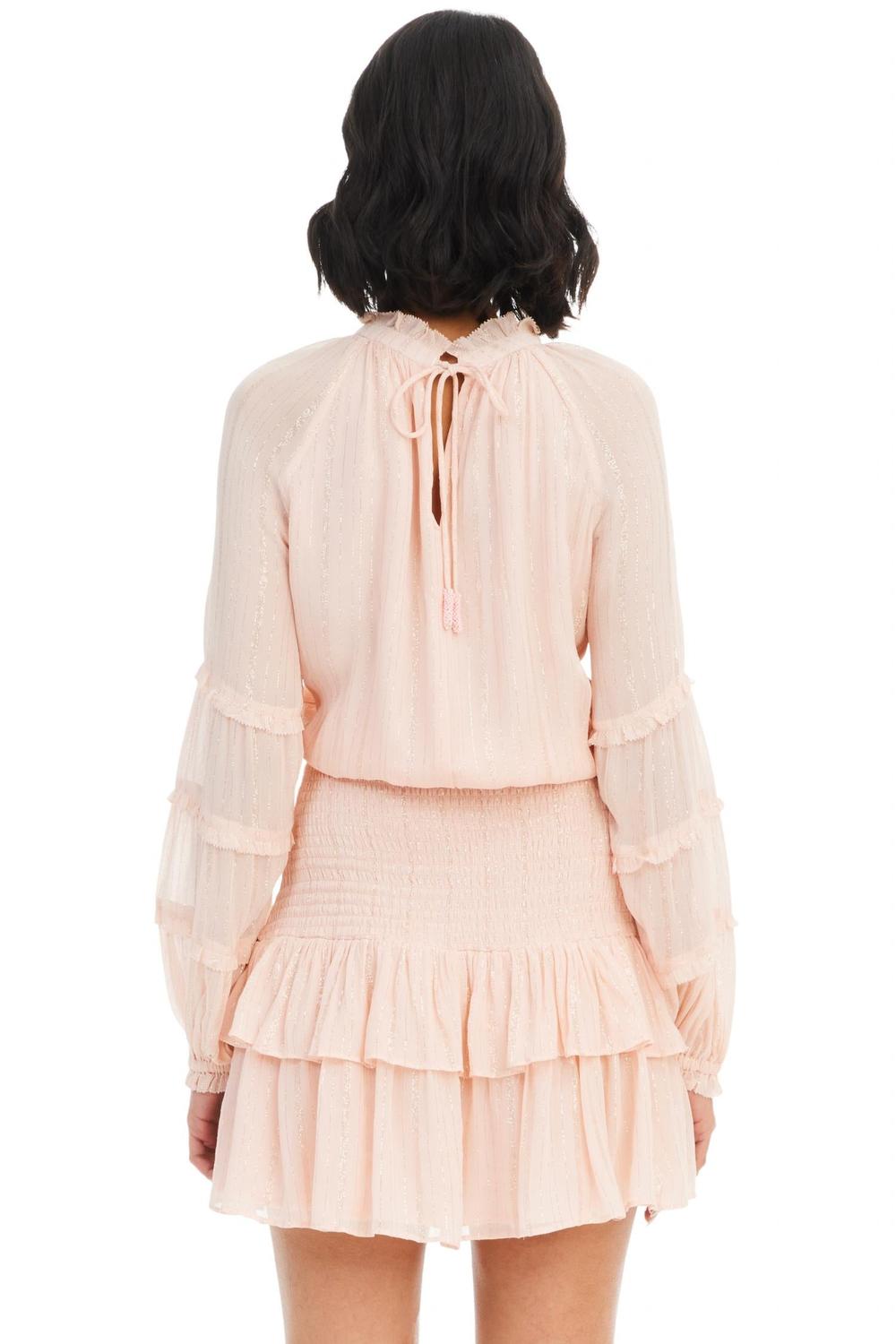 Это мини-платье имеет высокий оборчатый вырез с завязкой из бисера на шее сзади. Свободный крой переходит в облегающую, эластичную присборенную вставку на бедрах и оборчатую, кокетливую юбку. Длинные развевающиеся рукава имеют оборчатую отделку и эластичный нижний край. Полностью на подкладке. Изделие - 100% полиэстер. Подкладка - 100% полиэстер. Длина - 34". Ручная стирка, сушка в разложенном виде или химчистка.