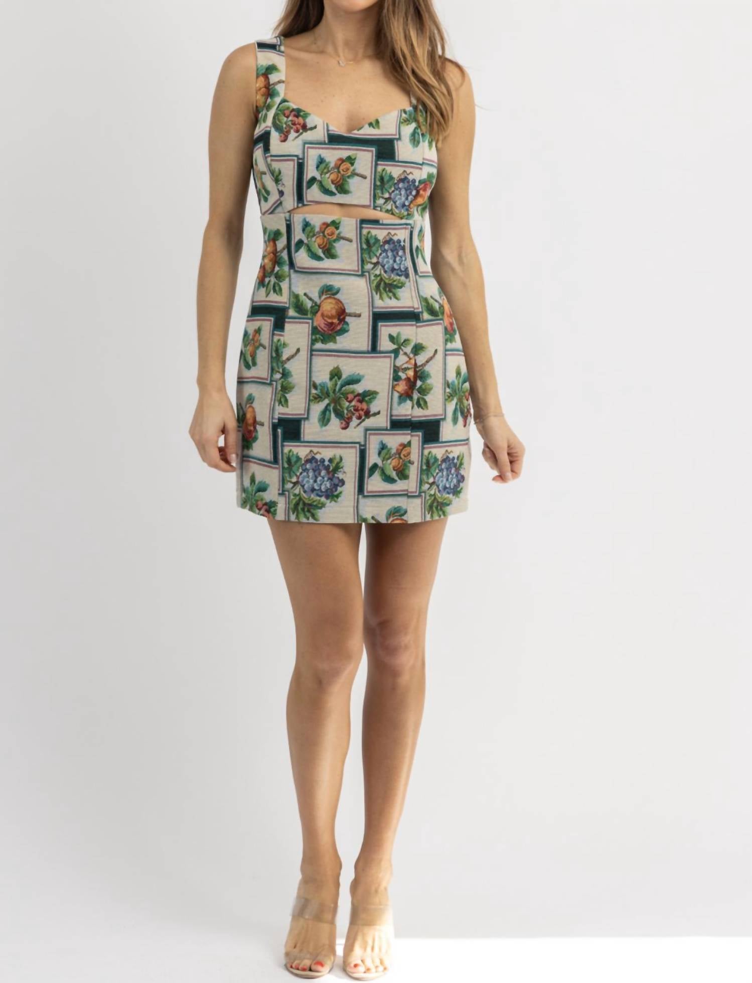 Эффектная модель из смеси 80% полиэстера и 20% хлопка. Идеальный баланс комфорта и прочности. Текстурированная жаккардовая ткань с очаровательным фруктовым узором. Платье длины мини. Имеет облегающий силуэт, который подчеркивает ваши изгибы. Открытый вырез-замочная скважина спереди и V-образный вырез добавляют немного очарования. Разработано для удобства с застежкой-молнией. Платье без рукавов столь же функционально, сколь и модно.