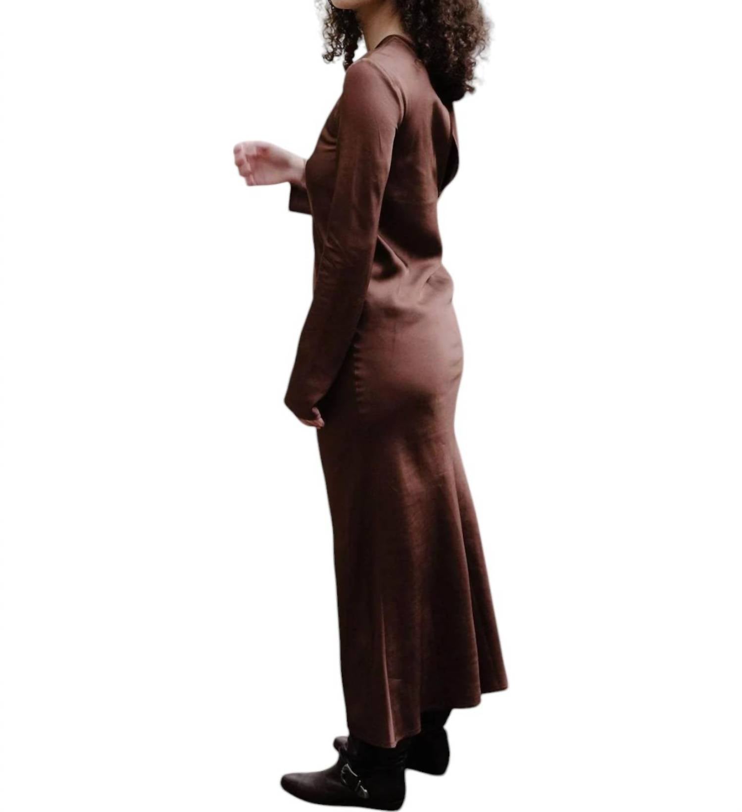 Темно-коричневое макси-платье, которое излучает непринужденную элегантность благодаря косому крою и длинным рукавам. Изготовлено из 100% вискозы Ecovero. Обеспечивает легкую струящуюся форму с небольшим клешем на подоле. Сделано в Турции. Имеет круглый вырез с застежкой на одну пуговицу сзади на горловине. Соответствует размеру. Уход прост: стирка в холодной воде на щадящем режиме.
