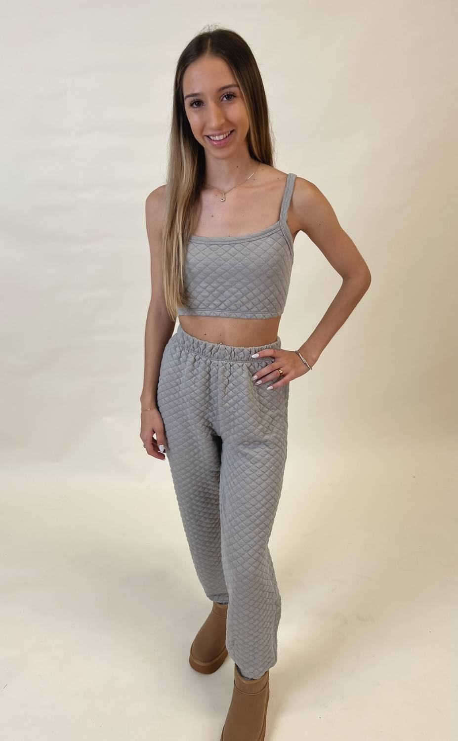 Идеальные брюки для бега по городу и при этом выглядеть круто. Побалуйте себя роскошным комфортом стеганых штанов Ayla Quilted Joggers от GEEGEE, выполненных с текстурированным узором в изысканном сером цвете. Эти штаны для бега имеют высокую посадку и удобные зауженные штанины, что делает их неотъемлемой частью любого гардероба. Разработанные с застежкой-липучкой и удобной посадкой, они обеспечивают идеальную посадку каждый раз. Сочетайте их со стеганым топом Ayla для создания непринужденно шикарного ансамбля.