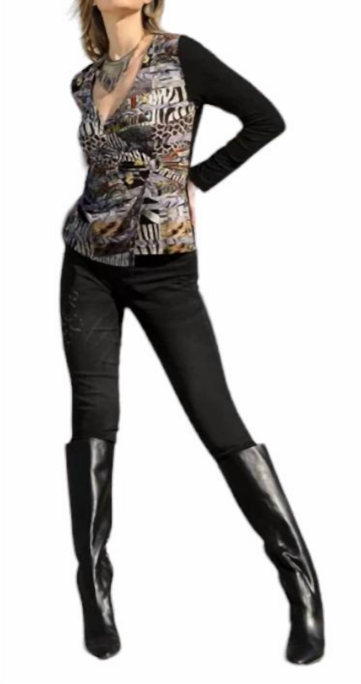 Топ с запахом и кольцом. Глубокий V-образный вырез. Яркий принт спереди. Длинные черные рукава. Эластичная ткань. Облегающий крой. Соответствует размеру. Машинная стирка наизнанку в холодной воде. 96% вискоза, 4% эластан.