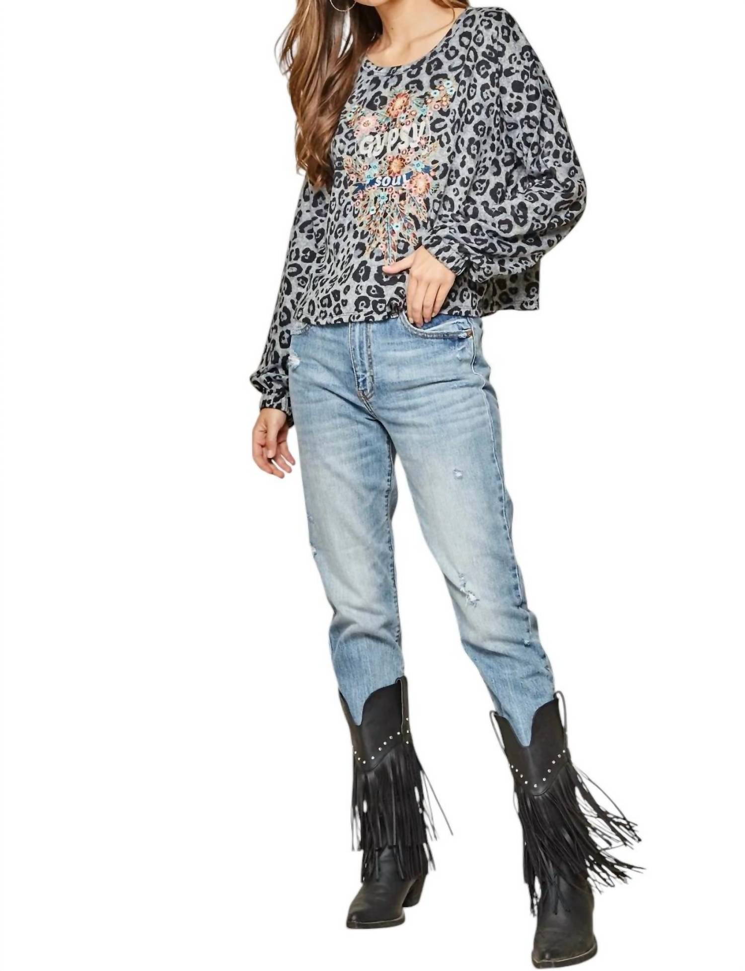 Этот великолепный вышитый топ имеет круглый вырез, спущенные плечи, длинные рукава-фонарики с резинкой и красочную вышивку на леопардовом принте. Изготовлен из 96% полиэстера и 4% спандекса. Длина - 22" (обычный размер), 25" (размер plus). Ручная стирка в холодной воде.