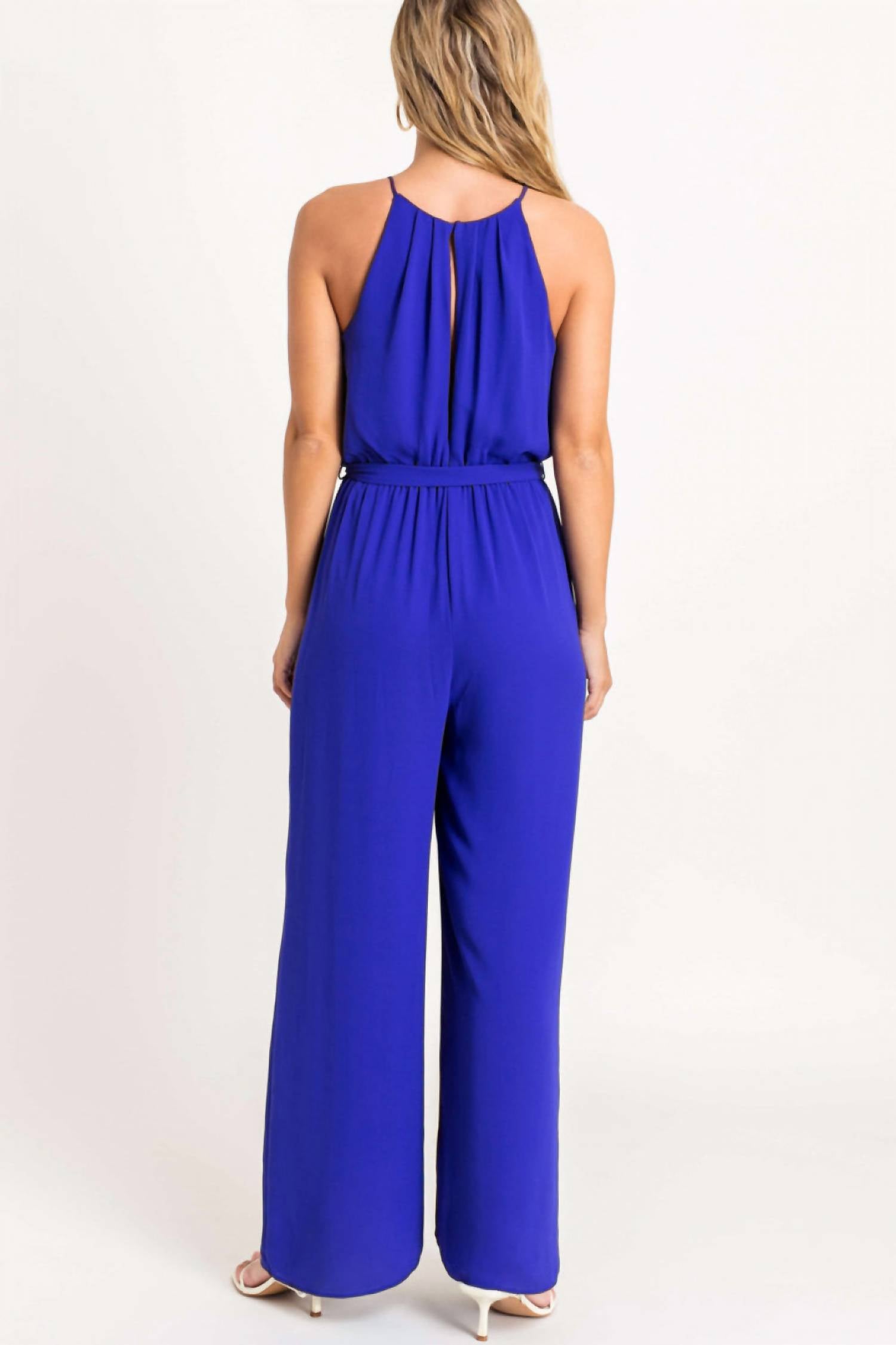 Имеет халтер-воротник, без рукавов, эластичный пояс с завязкой, большой вырез-замочная скважина на спине, полностью на подкладке и имеет широкий силуэт штанины. Маленькая грудь 36" внутренний шов 28"; Средняя грудь 38" внутренний шов 28"; Большая грудь 40" внутренний шов 28". 100% полиэстер, подкладка 100% полиэстер. Ручная стирка в холодной воде.
