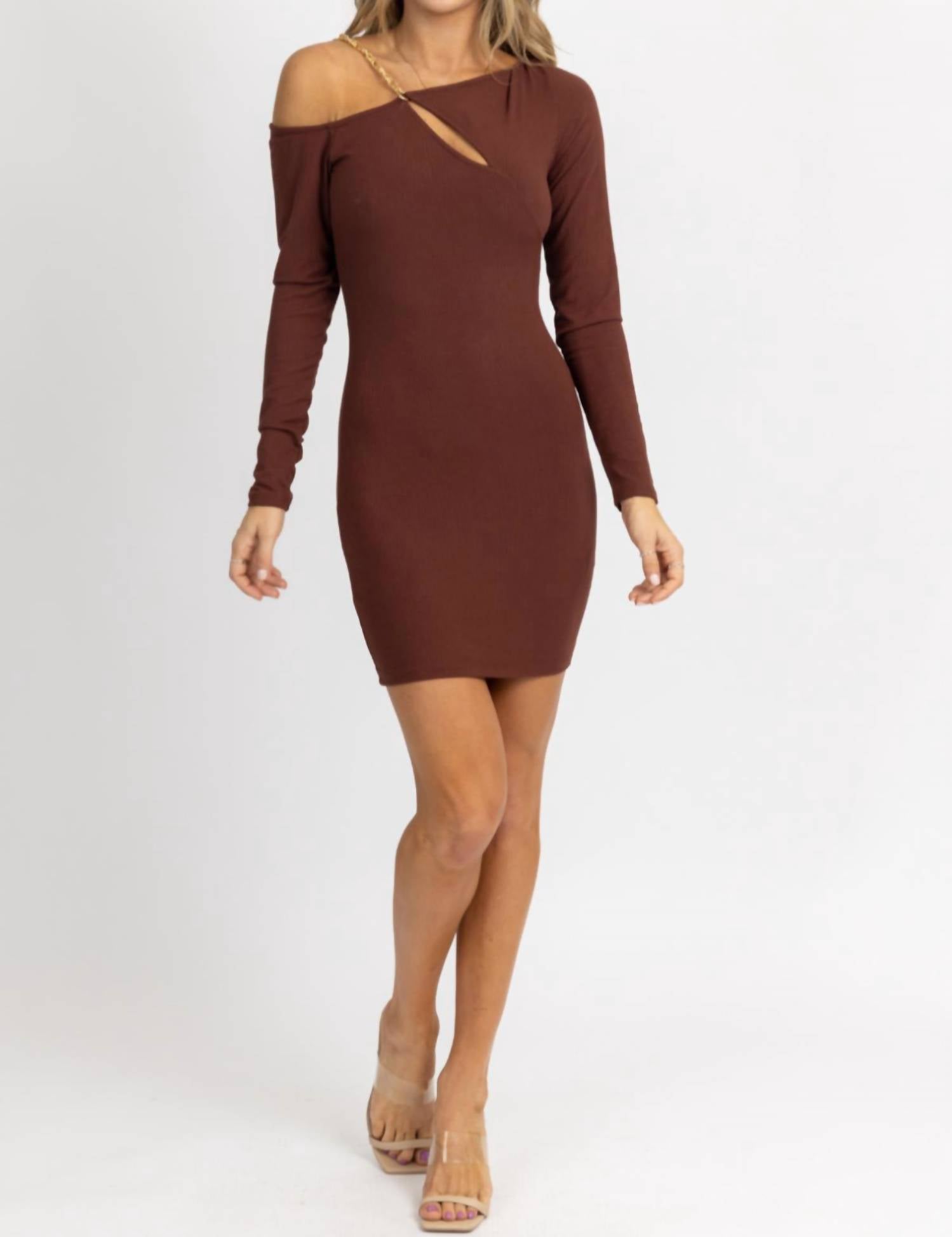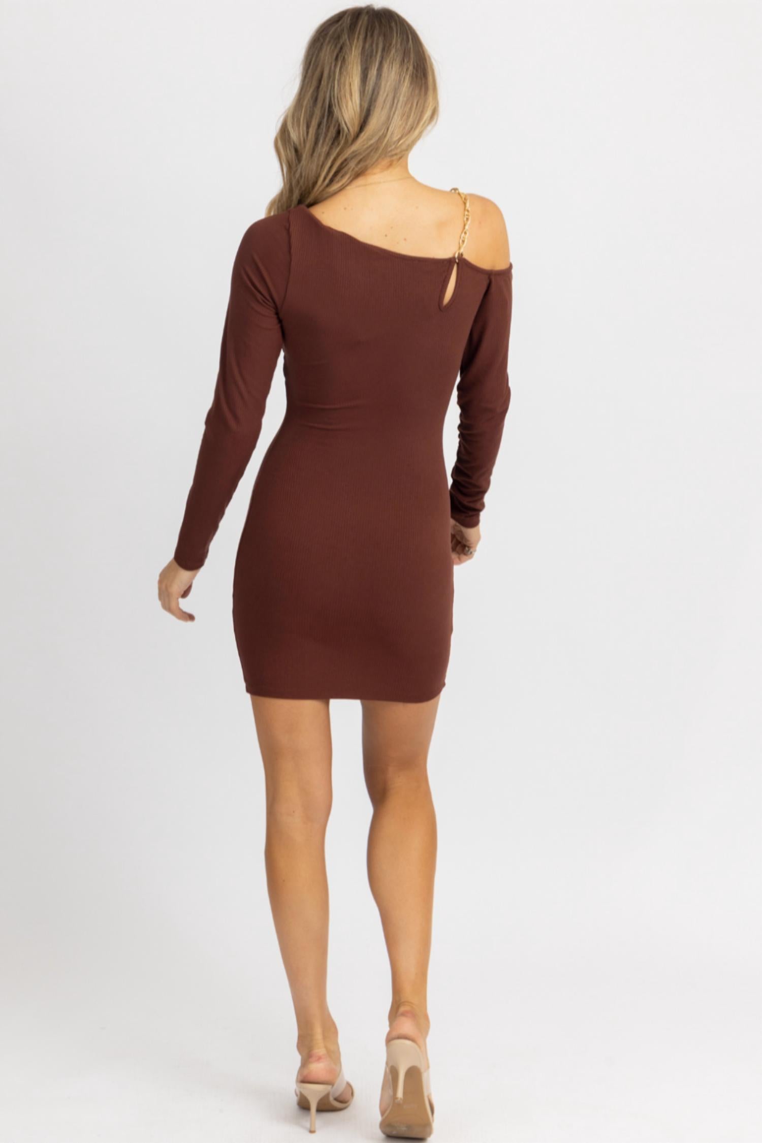 Мини-платье, асимметричный вырез, длинные рукава, ребристый крой, отделка цепочкой, приталенное. 95% вискоза, 5% спандекс. На модели размер small, рост 5'8, размер платья 2.