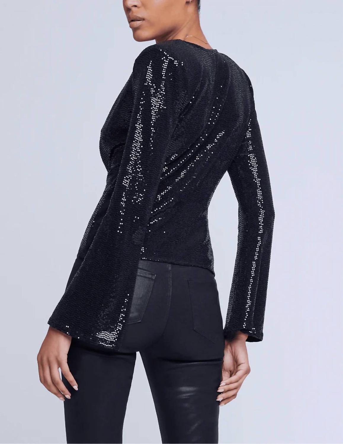 Длинные рукава. Глубокий V-образный вырез. Сильные плечи. Силуэт с перекрученным запахом. Рукава-колокольчики. Украшение пайетками по всей поверхности. 90% нейлон, 5% металлик, 5% спандекс. Импортное. Химчистка.