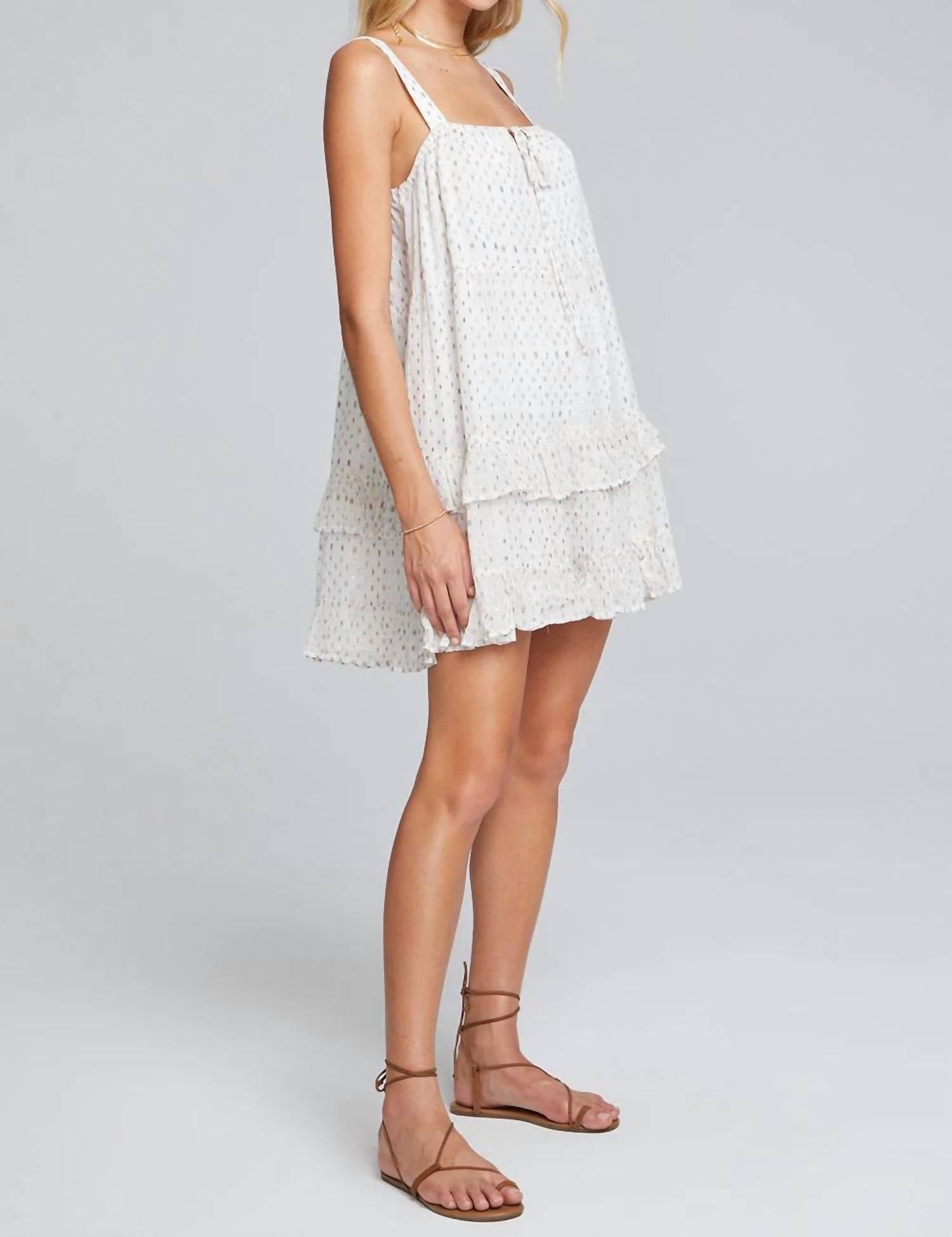 Платье Clarice Tank Mini с завязкой спереди и многоуровневым оборочным слоем. Рост модели 5 футов 9 дюймов, размер S. Состав ткани - 98% вискоза, 2% люрекс. Импортное.