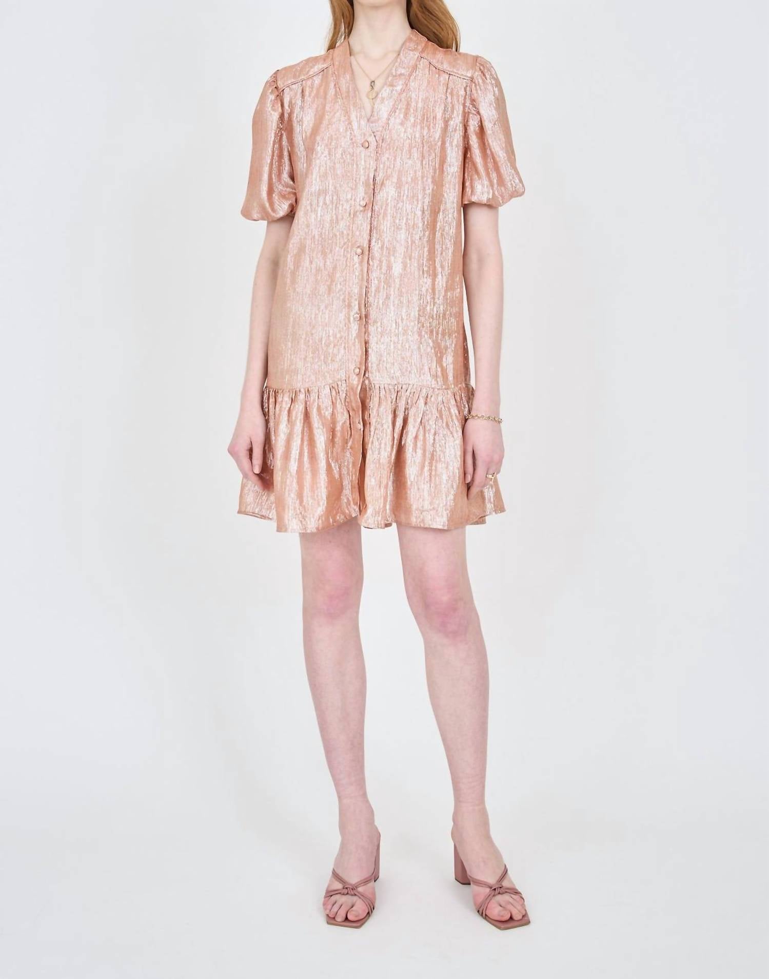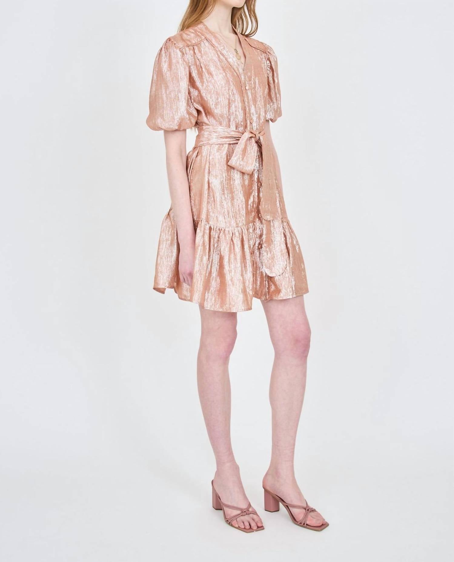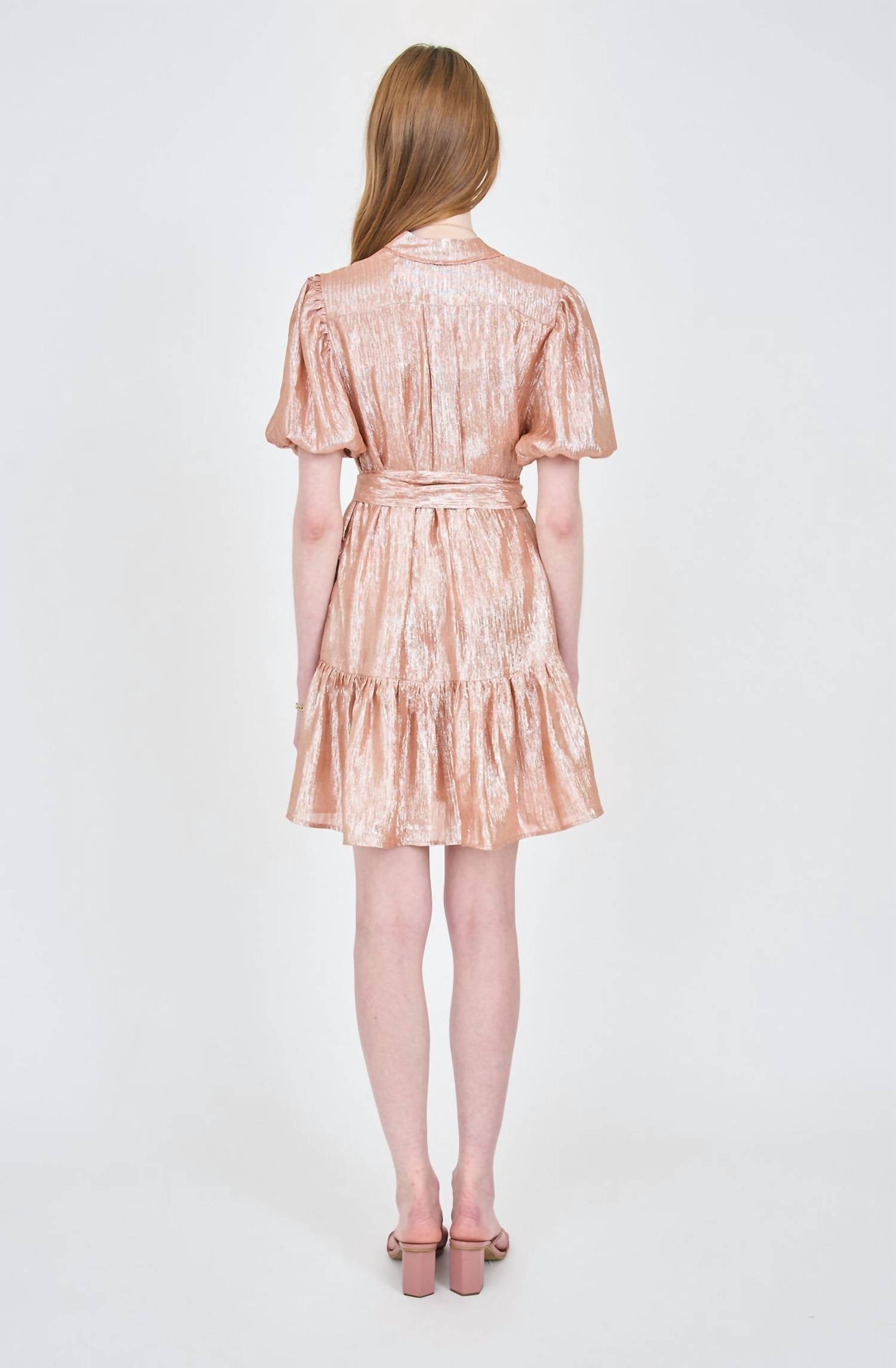 Платье длиной до колена с v-образным вырезом и тонкими рукавами-фонариками. Это платье застегивается на пуговицы по всей длине спереди и идет в комплекте с поясом-завязкой.